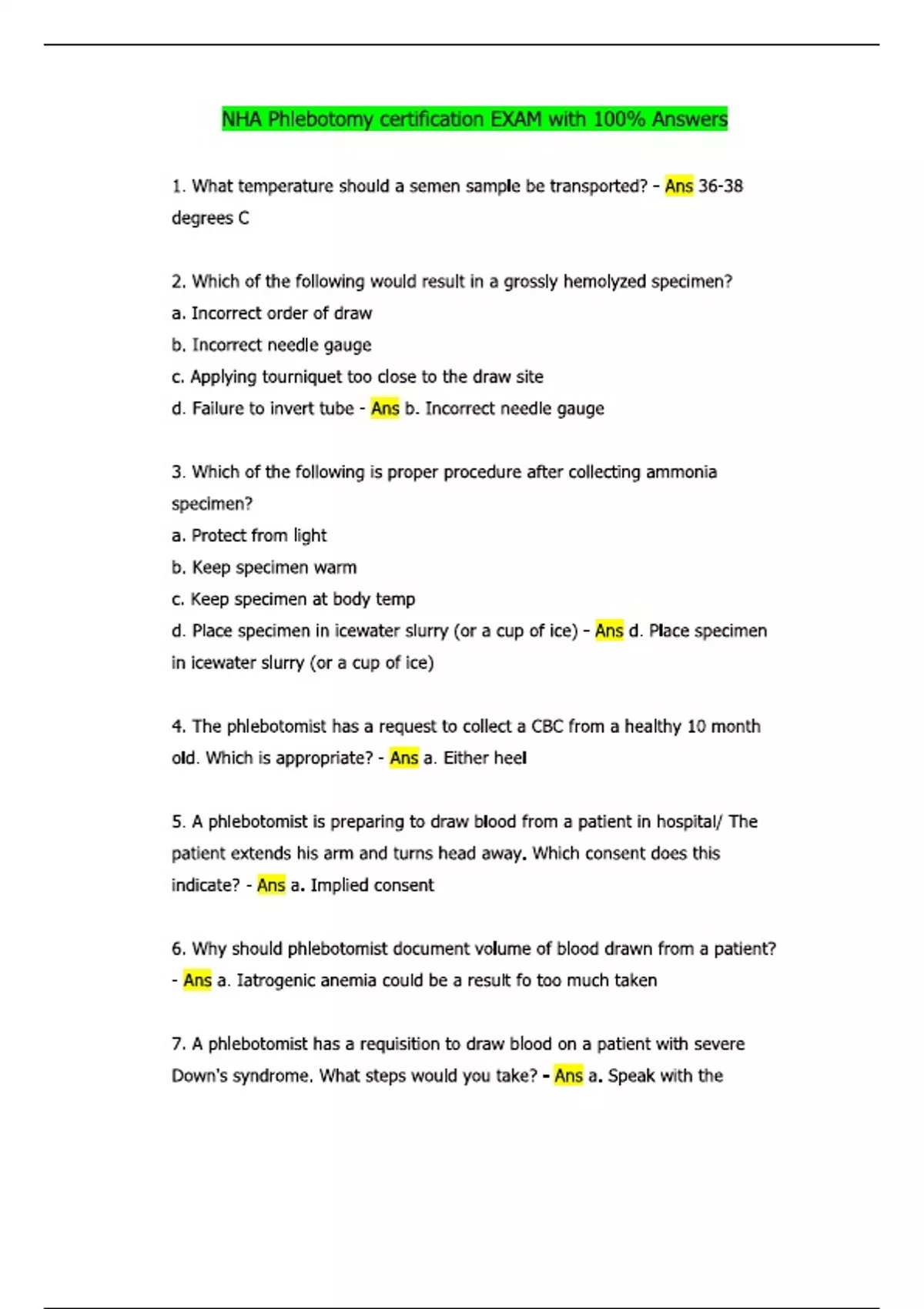 NHA Phlebotomy certification EXAM with 100% Answers 1. What temperature should a semen sample be transported? - Ans 36-38 degrees C 2. Which of the following would result in a grossly hemolyzed specimen? a. Incorrect order of draw b. Incorrect needle gauge c. Applying tourniquet too close to the draw site d. Failure to invert tube - Ans b. Incorrect needle gauge 3. Which of the following is proper procedure after collecting ammonia specimen? a. Protect from light b. Keep specimen warm c. Keep specimen at body temp d. Place specimen in icewater slurry (or a cup of ice) - Ans d. Place specimen in icewater slurry (or a cup of ice) 4. The phlebotomist has a request to collect a CBC from a healthy 10 month old. Which is appropriate? - Ans a. Either heel 5. A phlebotomist is preparing to draw blood from a patient in hospital/ The patient extends his arm and turns head away. Which consent does this indicate? - Ans a. Implied consent 6. Why should phlebotomist document volume of blood drawn from a patient? - Ans a. Iatrogenic anemia could be a result fo too much taken 7. A phlebotomist has a requisition to draw blood on a patient with severe Down's syndrome. What steps would you take? - Ans a. Speak with the patient guardian before performing venipuncture to enmsure the patient understands 8. A 69 year old unconscious patient is brought ot the ER. Several blood tests are ordered. The phlebotomist collects blood under - Ans a. Implied consent 9. Which of the following actions is appropriate when labeling specimens? - Ans a. Label specimens at the time of collection in front of the patient 10. Before collecting blood on an inpatient, the phlebotomist notices there's no wristband on wrist. There is one on the IV pole. What do you do? - Ans a. Don't draw until nurse puts an armband on patient 11. Which is appropriate form of identification in inpatient setting? - Ans a. Verbal and wrist band 12. WBC, RBC, Electrolytes are ordered. Which tubes are used for capillary? - Ans a. Lavender and red 13. A blood specimen is rejected by lab with QNS as the reason? Why? - Ans a. The specimen was insufficient-not enough blood 14. Which of the following is best method to prevent internal or external bleeding from venipuncture site after needle is removed? - Ans a. Apply pressure to prevent leakage of blood into the tissues 15. A physician orders a STAT but phlebotomist forgets to fill out patient ID number. What is appropriate procedure for an improperly labeled specimen when received in lab? - Ans a. Lab rejects the mislabeled specimen 16. Phlebotomist is performing venipuncture and patient begins to seize. What is correct action? - Ans a. Discontinue the draw 17. Phlebotomist receives orders to draw an infant screening card, O2 levels, bilirubin, and DNA. Which is to be drawn first? - Ans a. O2 levels