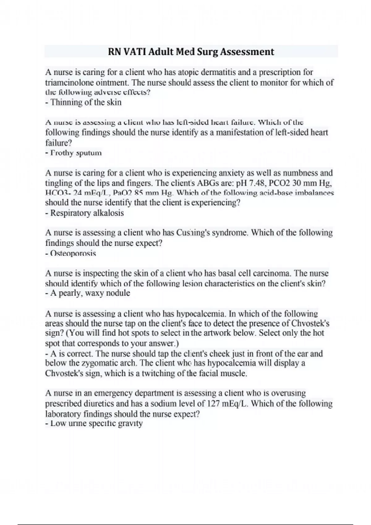 A nurse is caring for a client who has atopic dermatitis and a prescription for triamcinolone ointment. The nurse should assess the client to monitor for which of the following adverse effects? - Thinning of the skin A nurse is assessing a client who has left-sided heart failure. Which of the following findings should the nurse identify as a manifestation of left-sided heart failure? - Frothy sputum A nurse is caring for a client who is experiencing anxiety as well as numbness and tingling of the lips and fingers. The client's ABGs are: pH 7.48, PCO2 30 mm Hg, HCO3- 24 mEq/L, PaO2 85 mm Hg. Which of the following acid-base imbalances should the nurse identify that the client is experiencing? - Respiratory alkalosis A nurse is assessing a client who has Cushing's syndrome. Which of the following findings should the nurse expect? - Osteoporosis A nurse is inspecting the skin of a client who has basal cell carcinoma. The nurse should identify which of the following lesion characteristics on the client's skin? - A pearly, waxy nodule A nurse is assessing a client who has hypocalcemia. In which of the following areas should the nurse tap on the client's face to detect the presence of Chvostek's sign? (You will find hot spots to select in the artwork below. Select only the hot spot that corresponds to your answer.) - A is correct. The nurse should tap the client's cheek just in front of the ear and below the zygomatic arch. The client who has hypocalcemia will display a Chvostek's sign, which is a twitching of the facial muscle. A nurse in an emergency department is assessing a client who is overusing prescribed diuretics and has a sodium level of 127 mEq/L. Which of the following laboratory findings should the nurse expect? - Low urine specific gravity A home health nurse is assisting a client with planning care for a family member who has Alzheimer's disease. Which of the following instructions should the nurse include? - Remove clutter from rooms and hallways. A nurse is caring for a client who has developed acute respiratory distress syndrome (ARDS). Which of the following findings should the nurse identify as a manifestation of this syndrome? - Refractory hypoxemia An emergency room nurse is assessing a client who has asthma and difficulty breathing. Which of the following findings should indicate to the nurse that the client is experiencing status asthmaticus? - Use of accessory muscles A nurse is teaching a client who has a new prescription for phenytoin to treat a seizure disorder. Which of the following adverse effects should the nurse instruct the client to report immediately to the provider? - Skin rash A nurse is monitoring a client following a lumbar laminectomy. The client has a drain and indwelling urinary catheter. The nurse should identify which of the following findings as an indication of a complication of the surgery? - Clear drainage on the dressings A nurse is assessing a client who has right-sided heart failure. Which of the following findings should the nurse identify as a manifestation of right-sided heart failure? - Increased abdominal girth A nurse is caring for a client who recently assumed the role of caregiver for their aging parents who have chronic illnesses. The nurse should identify that which of the following statements by the client indicates acceptance of the role change? - "I changed the floor plan of our home to accommodate my father's wheelchair." A nurse is caring for a client who is receiving vancomycin intermittent IV bolus therapy for methicillin-resistant Staphylococcus aureus (MRSA). Which of the following findings is an indication to the nurse that the client is experiencing an adverse effect of the medication? - The client is becoming flushed. A nurse is caring for a male client who has a new prescription for cyclosporine following a kidney transplant. Which of the following findings should the nurse identify as an adverse effect of this therapy? - BUN 24 mg/dL A nurse is caring for a client who has dumping syndrome following a gastric resection. The nurse should monitor the client for which of the following complications of dumping syndrome? - Iron-deficiency anemia A nurse is assessing a client who takes salmeterol to treat moderate asthma. Which of the following findings should indicate to the nurse that the medication has been effective? - The client's daily peak expiratory flow (PEF) measures 85% above personal best. A nurse is providing teaching about health promotion activities for a client who has a new diagnosis of type 1 diabetes mellitus. Which of the following statements by the client indicates an understanding of the teaching? - "I will check my blood sugar level before exercising." A nurse is providing teaching to a client who has a new prescription for warfarin. Which of the following medications should the nurse instruct the client to avoid? (Select all that apply.) – -Aspirin -Naproxen A nurse is assisting with the care of a client who is scheduled for a thoracentesis. Which of the following interventions should the nurse plan to take? - Place the client leaning forward over the bedside table for the procedure. A nurse is providing discharge teaching about infection control at home for a client who has tuberculosis. Which of the following statements by the client indicates an understanding of the teaching? - "I will place my used tissues in a plastic bag." A nurse is teaching a client who is scheduled to receive radioactive iodine therapy for treatment of hyperthyroidism. Which of the following instructions should the nurse include in the teaching? - Use disposable utensils for meals. A nurse is providing preoperative teaching to a client who is scheduled for a radical prostatectomy. Which of the following information should the nurse include in the teaching? - A PCA pump will be used for postoperative pain control. A nurse is assessing a client's ECG strip and notes an irregular heart rate of 98/min with no clear P waves. Whic