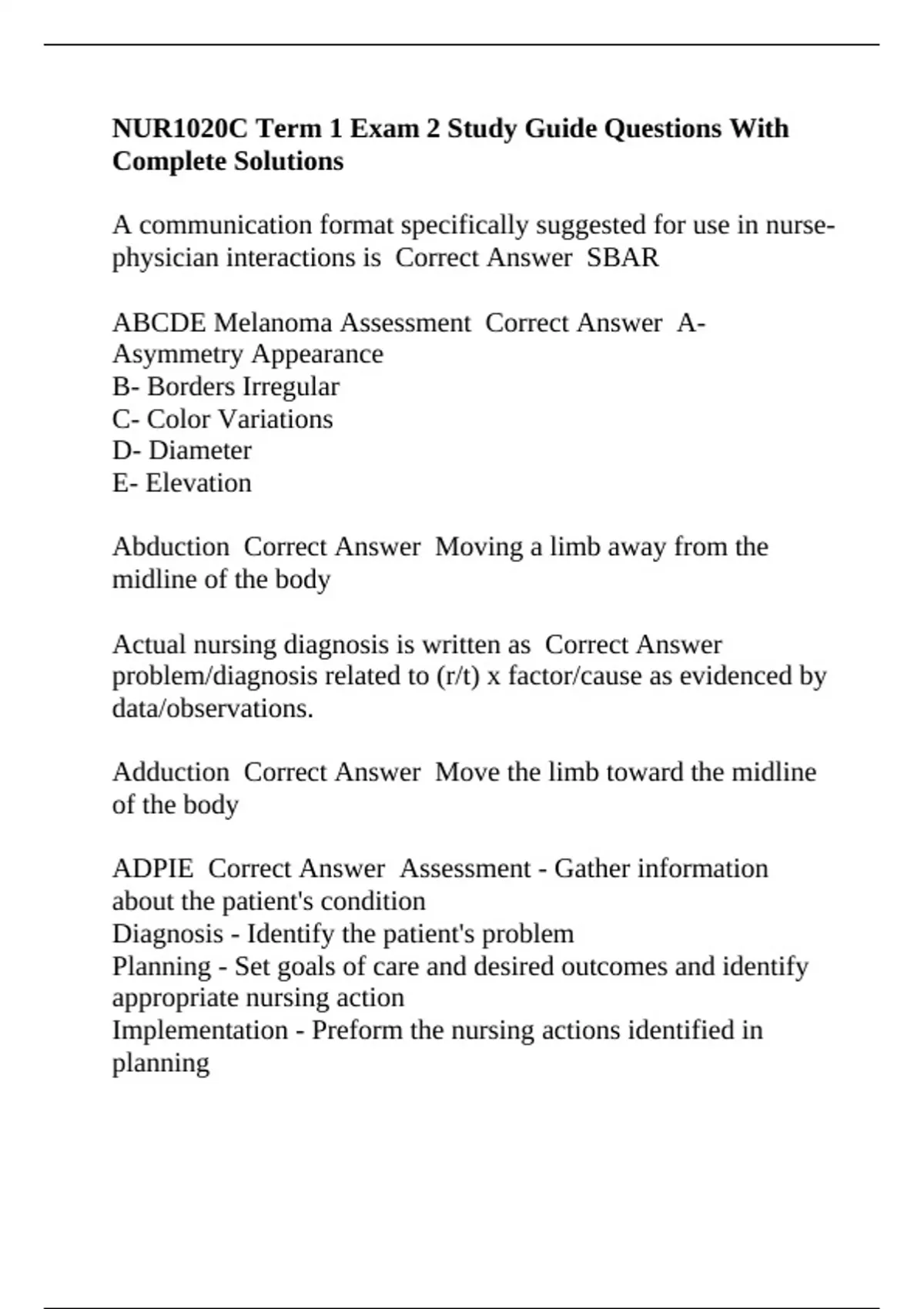 NUR1020C Term 1 Exam 2 Study Guide Questions With Complete Solutions