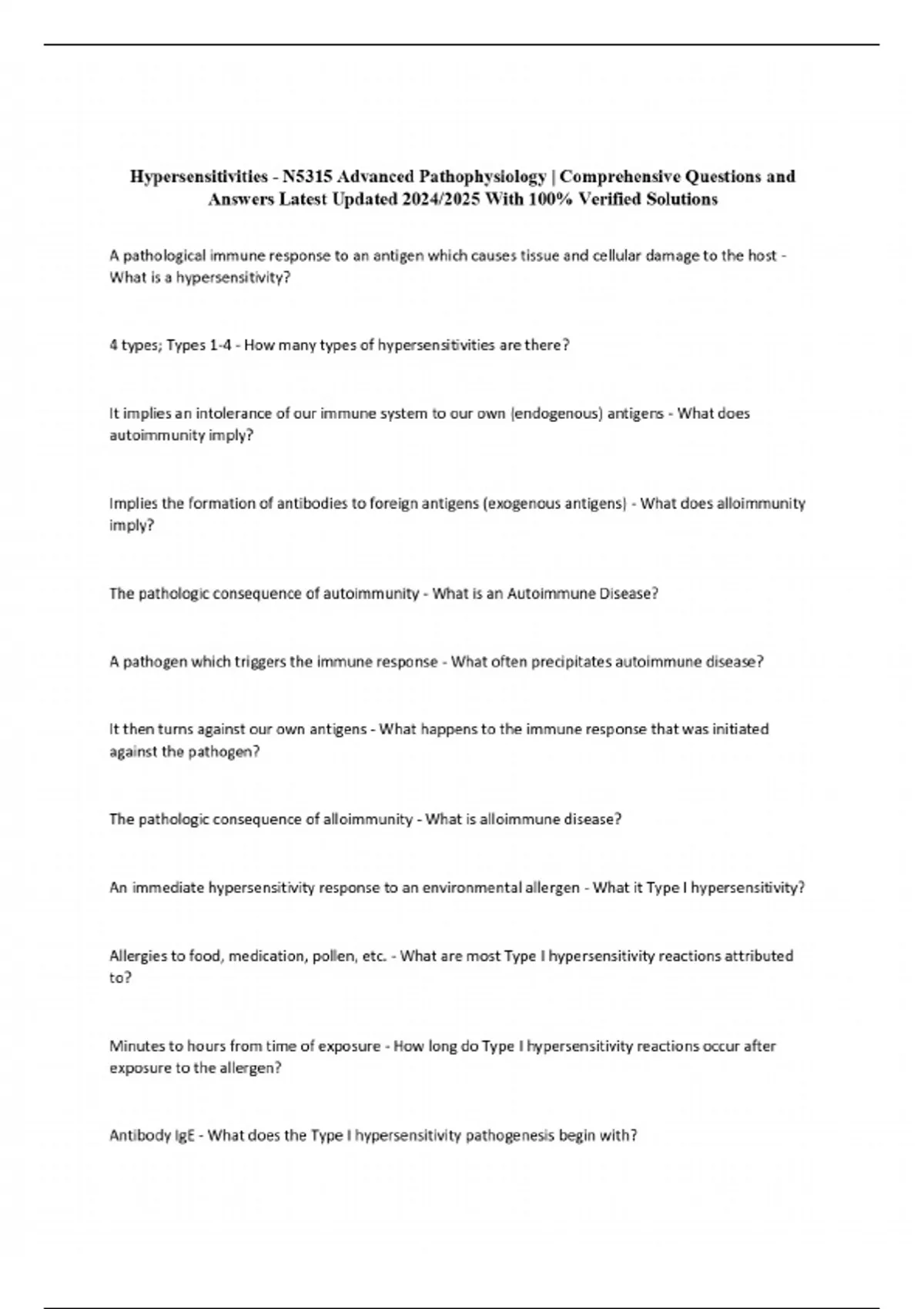 Hypersensitivities - N5315 Advanced Pathophysiology | Comprehensive Questions and Answers Latest Updated 2024/2025 With 100% Verified Solutions