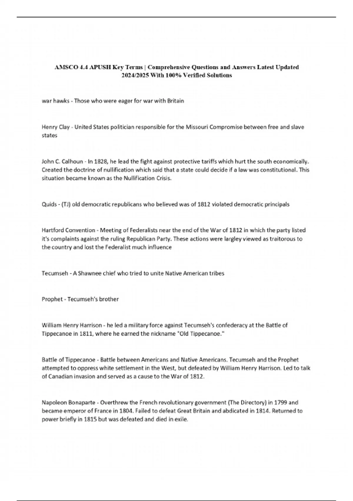 AMSCO 4.4 APUSH Key Terms | Comprehensive Questions and Answers Latest Updated 2024/2025 With 100% Verified Solutions