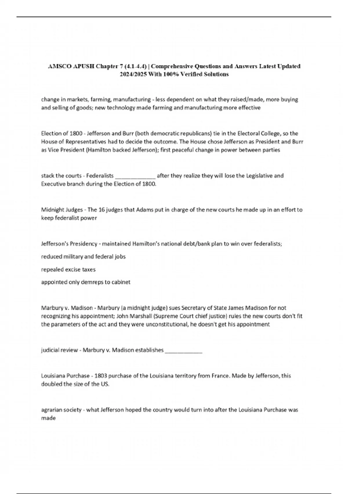 AMSCO APUSH Chapter 7 (4.1-4.4) | Comprehensive Questions and Answers Latest Updated 2024/2025 With 100% Verified Solutions