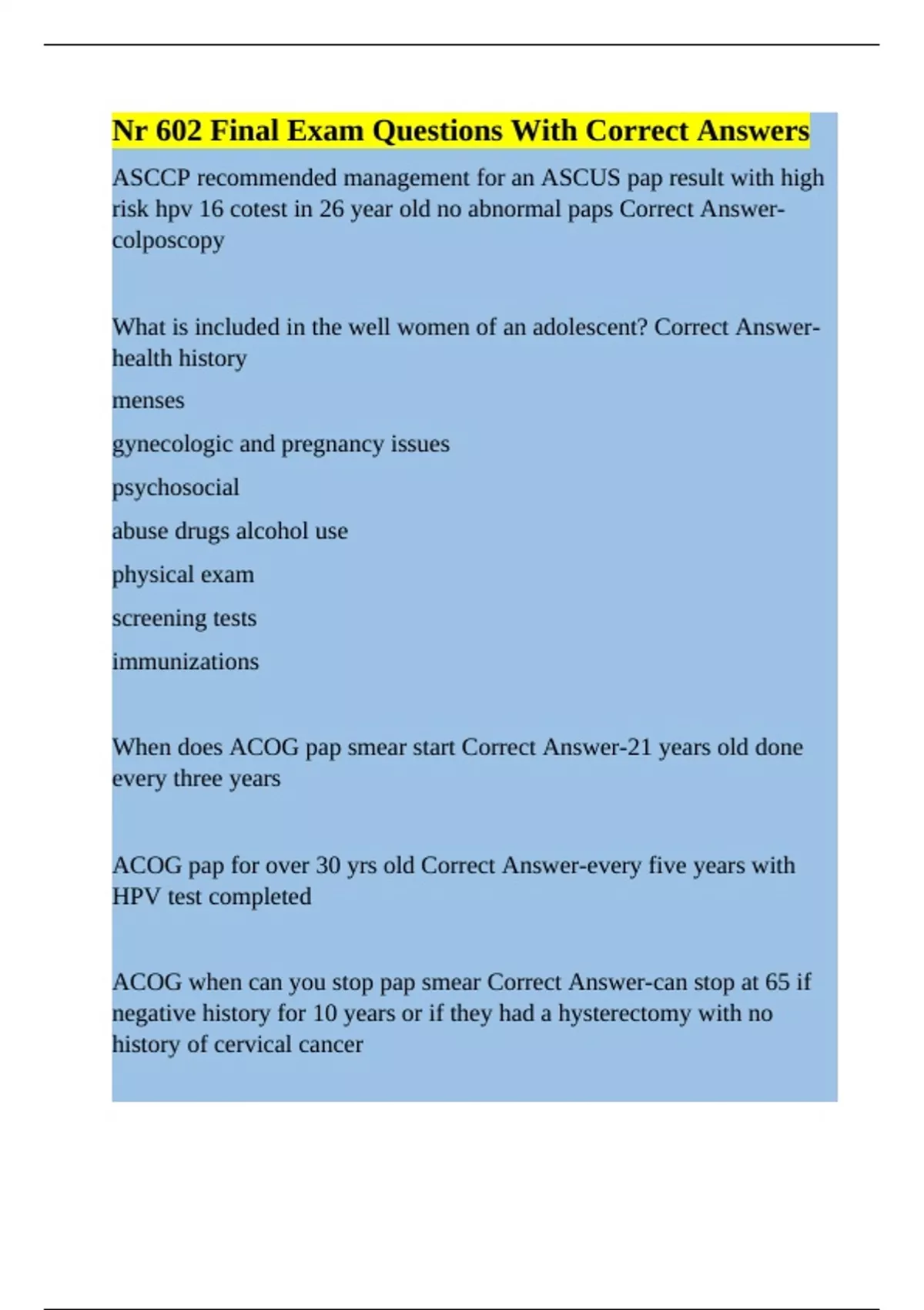 ACOG when can you stop pap smear Correct Answer-can stop at 65 if
