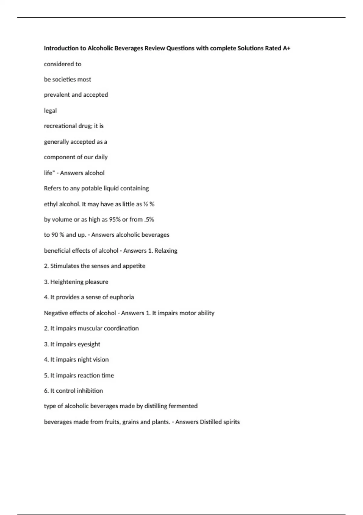 Introduction to Alcoholic Beverages Review Questions with complete Solutions Rated A+ considered to be societies most prevalent and accepted legal recreational drug; it is generally accepted as a component of our daily life" - Answers alcohol Refers to any potable liquid containing ethyl alcohol. It may have as little as ½ % by volume or as high as 95% or from .5% to 90 % and up. - Answers alcoholic beverages beneficial effects of alcohol - Answers 1. Relaxing 2. Stimulates the senses and appetite 3. Heightening pleasure 4. It provides a sense of euphoria Negative effects of alcohol - Answers 1. It impairs motor ability 2. It impairs muscular coordination 3. It impairs eyesight 4. It impairs night vision 5. It impairs reaction time 6. It control inhibition type of alcoholic beverages made by distilling fermented beverages made from fruits, grains and plants. - Answers Distilled spirits generally refers to distilled beverages that are low in sugar and containing at least 35% alcohol by volume. Gin, Vodka, Whisky, Brandy, Absinthe, Tequila, and traditional German schnapps are examples of spirits. - Answers spirits are distilled beverages with added flavorings and colorings that are high in sugar such as Grand Marnier, Frangelico and Kahlua. - Answers liqueurs the term means spirits; spirits and liqueurs; or all alcoholic beverages including wine, sake, beer. - Answers liquor classification of alcoholic beverage - Answers 1. fermentation 2. distillation is the process by which sugar is broken down into alcohol, carbon dioxide and other by product. - Answers fermentation is the process of reducing the water content of