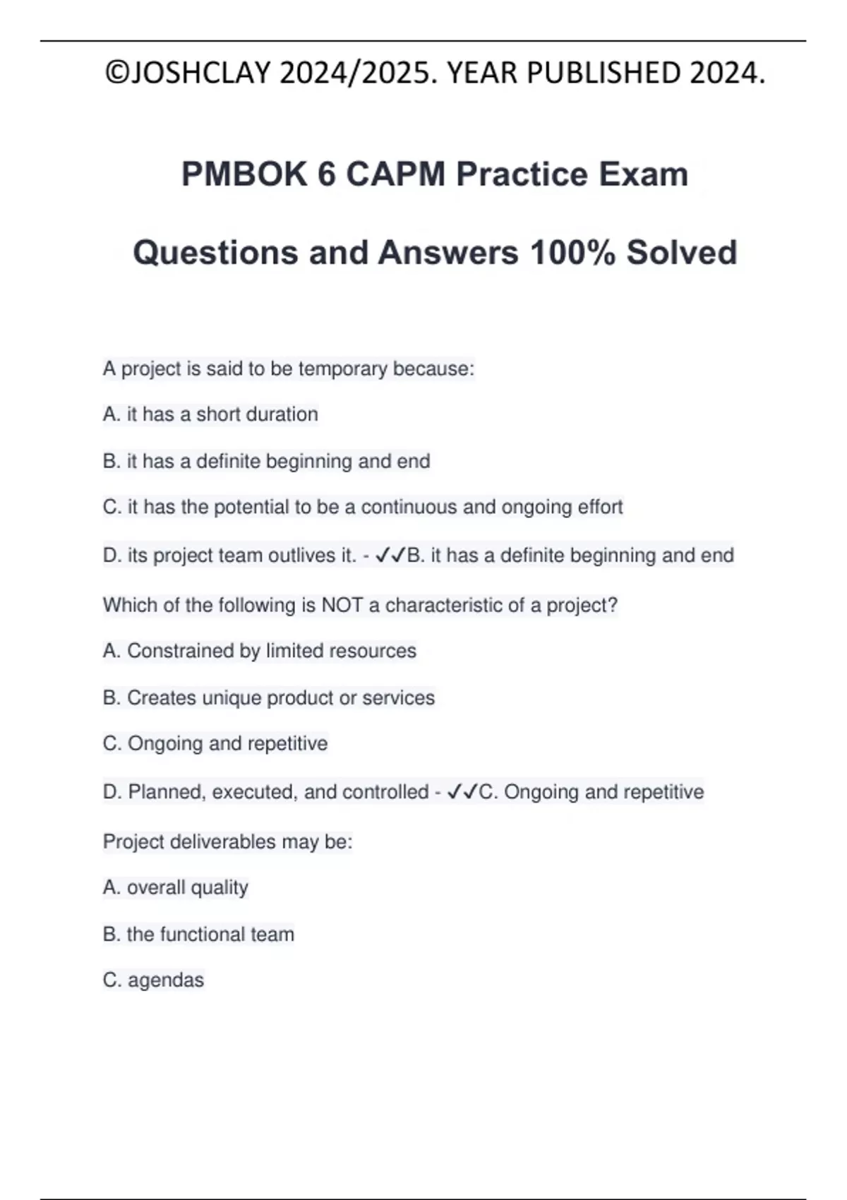 D. its project team outlives it. - ✔✔B. it has a definite beginning and end