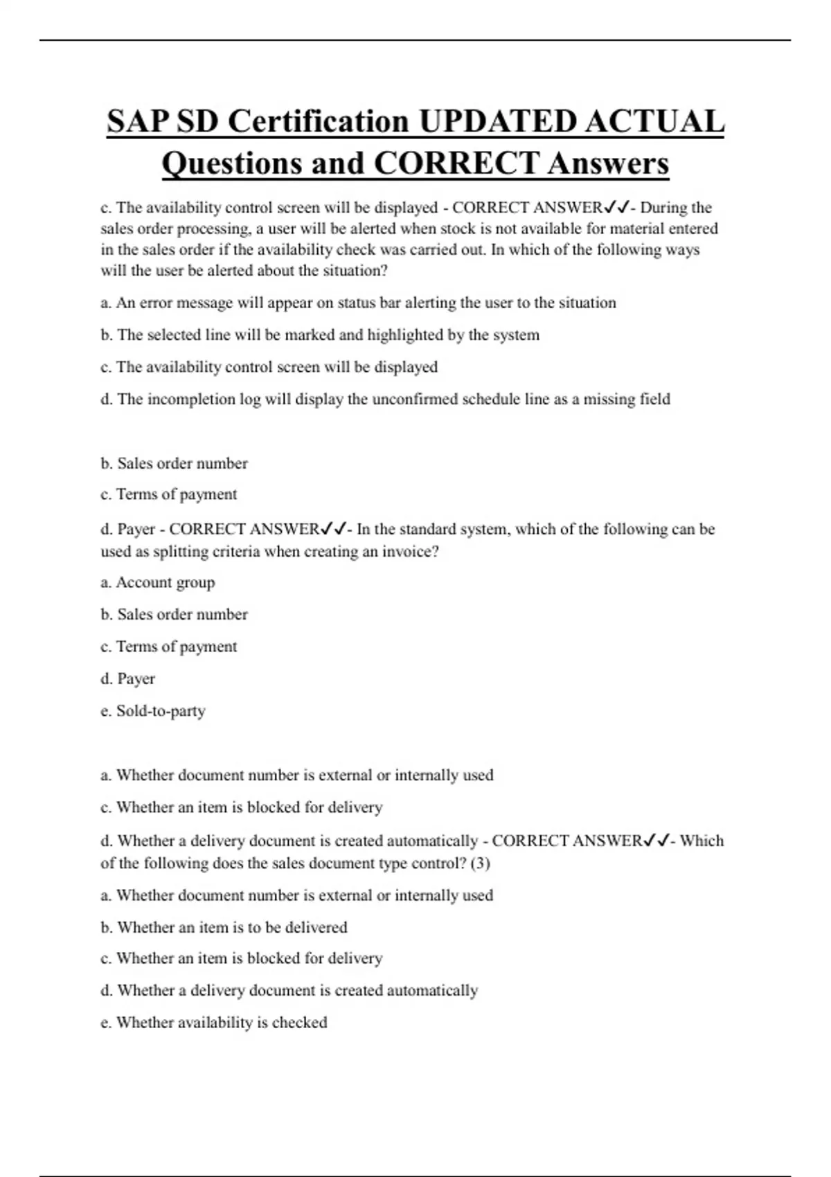 d. Whether a delivery document is created automatically - CORRECT ANSWER✔✔- Which
