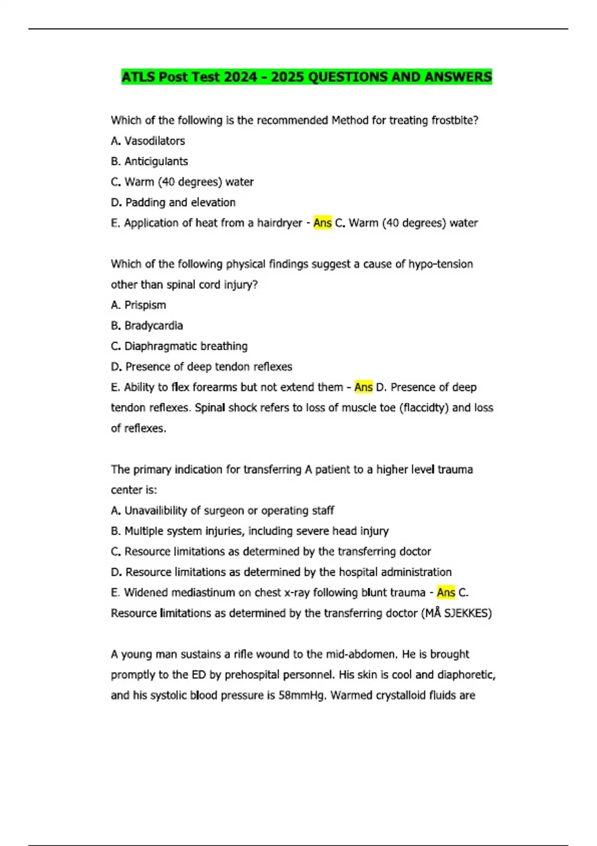 ATLS Post Test QUESTIONS AND ANSWERS Which of the following is the recommended Method for treating frostbite? A. Vasodilators B. Anticigulants C. Warm (40 degrees) water D. Padding and elevation E. Application of heat from a hairdryer - Ans C. Warm (40 degrees) water Which of the following physical findings suggest a cause of hypo-tension other than spinal cord injury? A. Prispism B. Bradycardia C. Diaphragmatic breathing D. Presence of deep tendon reflexes E. Ability to flex forearms but not extend them - Ans D. Presence of deep tendon reflexes. Spinal shock refers to loss of muscle toe (flaccidty) and loss of reflexes. The primary indication for transferring A patient to a higher level trauma center is: A. Unavailibility of surgeon or operating staff B. Multiple system injuries, including severe head injury C. Resource limitations as determined by the transferring doctor D. Resource limitations as determined by the hospital administration E. Widened mediastinum on chest x-ray following blunt trauma - Ans C. Resource limitations as determined by the transferring doctor (MÅ SJEKKES) A young man sustains a rifle wound to the mid-abdomen. He is brought promptly to the ED by prehospital personnel. His skin is cool and diaphoretic, and his systolic blood pressure is 58mmHg. Warmed crystalloid fluids are initiated without improvement in his vital signs. The next, most appropriate, step is to perform: A. a laparotomy B. An abdominal CT-scan C. Diagnostic laparoscopy D. Abdominal ultrasonography E. A diagnostic peritoneal lavage - Ans A. Laparotomy because of hemodynamic abnormality A 42-year-old man is trapped from the waist down beneath his overturned tractor for several hours before medical assistance arrives. He is awake and alert until just before arriving in the ED. He is now unconscious and responds only to painful stimuli by moaning. His pupils are 3mm in diameter and symmetrically reactive to light. Prehospital personnel indicate that they have not seen the patient move either of his lower extremities. On examination in the ED, no movement of his lower extremities are detected, even in response to painful stimuli. The most likely cause for this finding is: A. An epidural hematoma B. A pelvic fracture C. Central cord syndrome D. Intracerebral hemorrhage E. Bilateral compartment syndrome - Ans MÅ SJEKKES A 6-year-o boy is struck by an automobile and brought to the ED. He is lethargic, but withdraws purposefully from painful stimuli. His blood pressure is 90mmHg systolic, heart rate 140 beats per minute and his respiratory rate is 36 breaths per minute. The preferred route of venous access in this patient is: A. Percutaneous femoral vein cannulation B. Cutdown on the saphenous vein at the ankle C. Intraosseous catheter placement in the proximal tibia D. Percutaneous peripheral veins in the upper extremities E. Central venous access via the subclavian or internal jugular vein - Ans D. Percutaneous peripheral veins in the upper extremities A young man sustains a gunshot wound to the abdomen and is brought promptly to the ED by prehospital personnel. His skin is cool and diaphoretic, and he is confused. His pulse is thready and his femoral pulse is only weakly palpable. The definitive treatment in managing this patient is to: A. Administer O-negative blood B. Apply external warming devices C. Control internal hemorrhage operatively D. Apply a pneumatic antishock garment (PASG) E. Infuse large volumes of intravenous crystalloid solutions. - Ans C. Control internal hemorrhage operatively Regarding shock in the child, which of the following is FALSE? A. Vital signs are age-related B. Children have greater physiologic reserves than do adults C. Tachycardia is the primary physiologic response to hypovolemia D. The absolute volume of blood loss required to produce shock is the same as in adults E. An initial fluid bolus for resuscitation should approximate 20ml/kg Ringers Lactate - Ans D. The absolute volume of blood loss required to produce shock is the same as in adults A 33-year-old man is struck by a car travelling at 56km/h (35mph). He has obvious fractures of the left tibia near the knee, pain in the pelvic area, and severe dyspnea. His heart rate is 182 beats per minute, and his respiratory rate is 48 breaths per minute with no breath sounds heard in the left chest. A tension pneumothorax is relieved by immediate needle decompression and tube thoracostomy. Subsequently, his heart rate decreases to 144 beats per minute, his respirartory rate decreases to 36 breaths per minute and his blood pressure is 81/53 mmHg. Warmed Ringers lactate is adminstered intravenously. The next priority should be to: A. Perform external fixation of the pelvis B. Obtain abdominal and pelvic Ct-scans C. Perform arterial embolization of the pelvic vessel D. Perform diagnostic peritoneal lavage or FAST E. Perform a urethrogram and cystogram - Ans D. Perform diagnostic peritoneal lavage or FAST