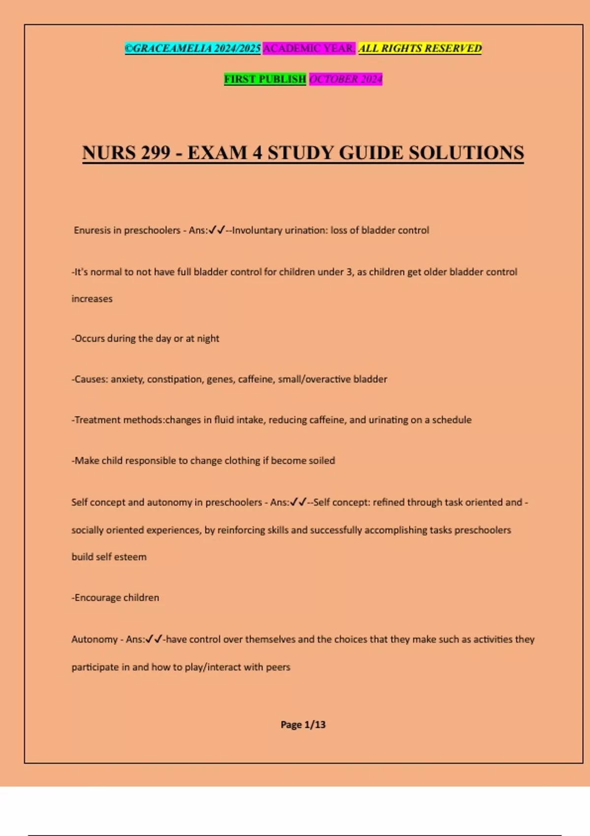 NURS 299 - EXAM 4 STUDY GUIDE SOLUTIONS Enuresis in preschoolers - Ans:--Involuntary urination: loss of bladder control -It's normal to not have full bladder control for children under 3, as children get older bladder control increases -Occurs during the day or at night -Causes: anxiety, constipation, genes, caffeine, small/overactive bladder -Treatment methods:changes in fluid intake, reducing caffeine, and urinating on a schedule -Make child responsible to change clothing if become soiled Self concept and autonomy in preschoolers - Ans:--Self concept: refined through task oriented and - socially oriented experiences, by reinforcing skills and successfully accomplishing tasks preschoolers build self esteem -Encourage children Autonomy - Ans:-have control over themselves and the choices that they make such as activities they participate in and how to play/interact with peers ©GRACEAMELIA 2024/2025 ACADEMIC YEAR. ALL RIGHTS RESERVED FIRST PUBLISH OCTOBER 2024 Page 2/13 Foods commonly associated with allergic reactions in toddlers - Ans:--Most allergies develop before the age of 2 -Milk -Eggs -Peanuts( reaction to peanuts tend to decrease over time) -Clear food labeling and education are essential for prevention of allergic reactions Primary strategy for child abuse - Ans:-promoting awareness of violence as a social problem, public awareness campaigns that provide information on how and where to report suspected child abuse and neglect Secondary strategy for child abuse - Ans:-offering community/school programs to teach nonviolent conflict resolution skills to people of all ages Tertiary strategy for child abuse - Ans:-Parent mentor programs with stable, nonabusive families acting as "role models" and providing support to families in crisis, family preservation services What genetic problems most likely appear during preschool years? - Ans:--Cystic fibrosis -Duchenne muscular dystrophy -Fragile X syndrome ©GRACEAMELIA 2024/2025 ACADEMIC YEAR. ALL RIGHTS RESERVED FIRST PUBLISH OCTOBER 2024 Page 3/13 -Williams syndrome -Autism Abstract thinking - Ans:-involves mental process (thinking outside the box) are able to visualize possibilities outside of the concrete information in front of them Concrete thinking - Ans:--involves facts and descriptions about everyday tangible objects ---Egocentrism is less ---Irreversibility Preschoolers and safety: Most common accidents - Ans:--Most likely to sustain injuries related to falls, poisoning and thermal injuries -Motor vehicle accidents: to prevent/lower accidents proper car seats -Burns: teach danger of matches,open flames, hot -objects, don't leave cigarettes/matches on counters -Drowning: proper fencing, floatation devices, water survival, supervision -Bicycle: helmet, age appropriate limits needed -Automobile related risks: teach proper street cr