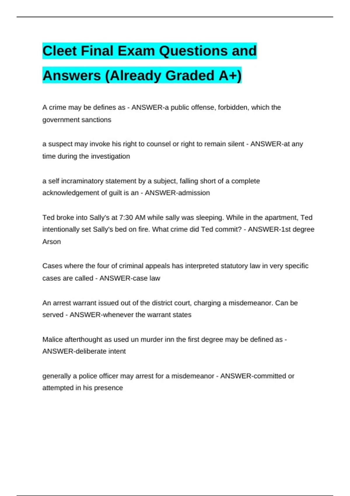 Cleet Final Exam Questions and Answers (Already Graded A+)Cleet Final Exam Questions and Answers (Already Graded A+)Cleet Final Exam Questions and Answers (Already Graded A+)Cleet Final Exam Questions and Answers (Already Graded A+)A crime may be defines as - ANSWER-a public offense, forbidden, which the government sanctions a suspect may invoke his right to counsel or right to remain silent - ANSWER-at any time during the investigation a self incraminatory statement by a subject, falling short of a complete acknowledgement of guilt is an - ANSWER-admission