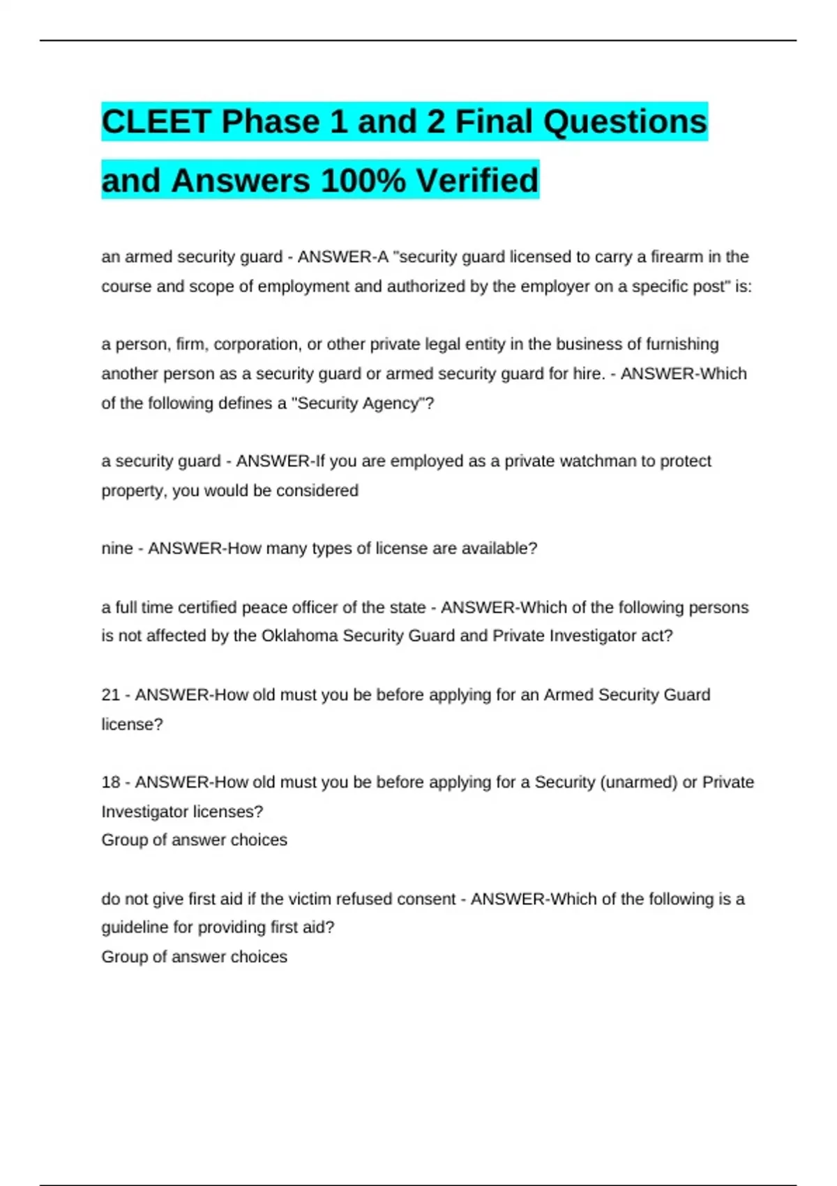 CLEET Phase 1 and 2 Final Questions and Answers 100% VerifiedCLEET Phase 1 and 2 Final Questions and Answers 100% VerifiedCLEET Phase 1 and 2 Final Questions and Answers 100% VerifiedCLEET Phase 1 and 2 Final Questions and Answers 100% Verified an armed security guard - ANSWER-A "security guard licensed to carry a firearm in the course and scope of employment and authorized by the employer on a specific post" is: a person, firm, corporation, or other private legal entity in the business of furnishing another person as a security guard or armed security guard for hire. - ANSWER-Which of the following defines a "Security Agency"?