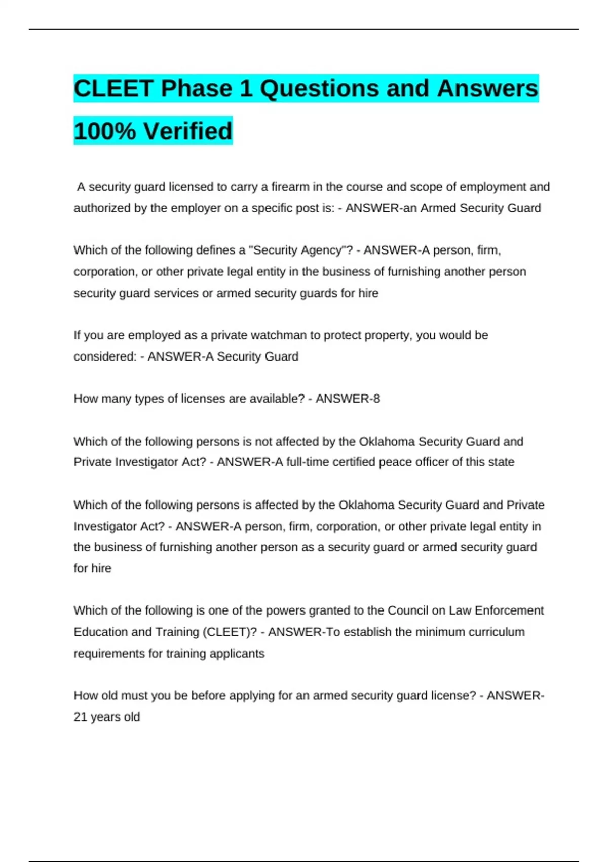 Education and Training (CLEET)? - ANSWER-To establish the minimum curriculum