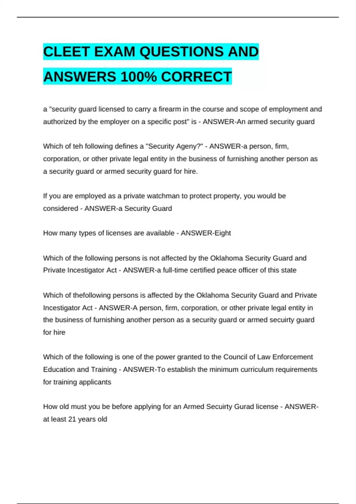 CLEET EXAM QUESTIONS AND ANSWERS 100% CORRECTCLEET EXAM QUESTIONS AND ANSWERS 100% CORRECTCLEET EXAM QUESTIONS AND ANSWERS 100% CORRECTCLEET EXAM QUESTIONS AND ANSWERS 100% CORRECTauthorized by the employer on a specific post" is - ANSWER-An armed security guard Which of teh following defines a "Security Ageny?" - ANSWER-a person, firm, corporation, or other private legal entity in the business of furnishing another person as a security guard or armed security guard for hire. If you are employed as a private watchman to protect property, you would be considered - ANSWER-a Security Guard