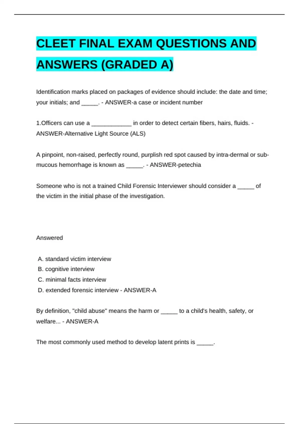 CLEET FINAL EXAM QUESTIONS AND ANSWERS (GRADED A)CLEET FINAL EXAM QUESTIONS AND ANSWERS (GRADED A)CLEET FINAL EXAM QUESTIONS AND ANSWERS (GRADED A)CLEET FINAL EXAM QUESTIONS AND ANSWERS (GRADED A)CLEET FINAL EXAM QUESTIONS AND ANSWERS (GRADED A)Identification marks placed on packages of evidence should include: the date and time; your initials; and _____. - ANSWER-a case or incident number 1.Officers can use a ____________ in order to detect certain fibers, hairs, fluids. - ANSWER-Alternative Light Source (ALS) A pinpoint, non-raised, perfectly round, purplish red spot caused by intra-dermal or sub-mucous hemorrhage is known as _____. - ANSWER-petechia