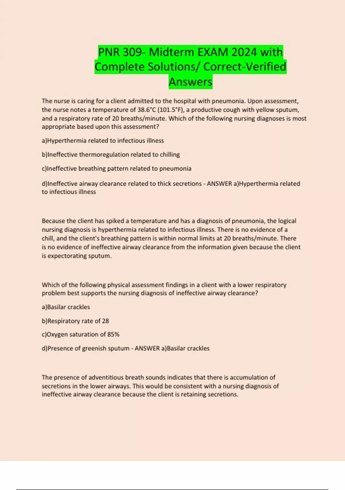 d)Presence of greenish sputum - ANSWER a)Basilar crackles