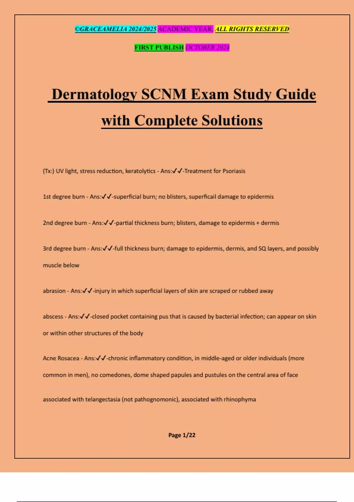 Dermatology SCNM Exam Study Guide with Complete Solutions (Tx:) UV light, stress reduction, keratolytics - Ans:-Treatment for Psoriasis 1st degree burn - Ans:-superficial burn; no blisters, superficail damage to epidermis 2nd degree burn - Ans:-partial thickness burn; blisters, damage to epidermis + dermis 3rd degree burn - Ans:-full thickness burn; damage to epidermis, dermis, and SQ layers, and possibly muscle below abrasion - Ans:-injury in which superficial layers of skin are scraped or rubbed away abscess - Ans:-closed pocket containing pus that is caused by bacterial infection; can appear on skin or within other structures of the body Acne Rosacea - Ans:-chronic inflammatory condition, in middle-aged or older individuals (more common in men), no comedones, dome shaped papules and pustules on the central area of face associated with telangectasia (not pathognomonic), associated with rhinophyma ©GRACEAMELIA 2024/2025 ACADEMIC YEAR. ALL RIGHTS RESERVED FIRST PUBLISH OCTOBER 2024 Page 2/22 Acne vulgaris - Ans:-abnormal keratinization of the follicular epithelium, increased sebum production (d/t angrogen receptors on the sebaceous gland), bactterial lipase produces irritating fatty acids causing an inflammatory reaction acral-lentiginous melanoma - Ans:-melanoma that occurs in the distal extremities usually: nails, soles of feet darkly pigmented, common in asians and African Americans Actinic Keratoses - Ans:-rough, scaling, red-brown macules and papules,precancerous skin growth found on sun-exposed areas, looks like a red scaly patch, feels like sandpaper can give rise to squamous cell carcinoma Allergic contact dermatitis - Ans:-dermatitis caused by irritant, low concentration of a substance can sensitize, Rapid onset, borders may be well-defined T cell mediated (must have prior exposure) alopecia areata - Ans:-autoimmune disorder attacks hair follicles, well-defined bald ares on scalp or on body, begins in childhood self-resolving (must distinguish from tichotella mania) alopecia capitis totalis - Ans:-uncommon condition of loss of all hair on scalp ©GRACEAMELIA 2024/2025 ACADEMIC YEAR. ALL RIGHTS RESERVED FIRST PUBLISH OCTOBER 2024 Page 3/22 alopecia universalis - Ans:-total loss of hair on all parts of the body Angioedema - Ans:-swelling of lips and eyelids Associated with Acne Vulgaris: inflammatory lesions: papules, pustules, cysts - Ans:-Open comedones associated with Acne Vulgaris: Non-inflammatory lesions: whiteheads, blackheads - Ans:-Closed comedones Asymmetry (horizonal or vertical plane) Border is irregular Coloring- multiple colors within lesion Diameter >6mm - Ans:-ABCDs of Malignant Melaoma Atopic dermatitis - Ans:-chronic genetic disease, precipitated by environmental stress on genetically compromised skin, Sx: ill defined borders, antecubital and popliteal fossas, symmetrical, lichenification common early age- face/scalp/diaper-area, older adults- flexor surfaces,