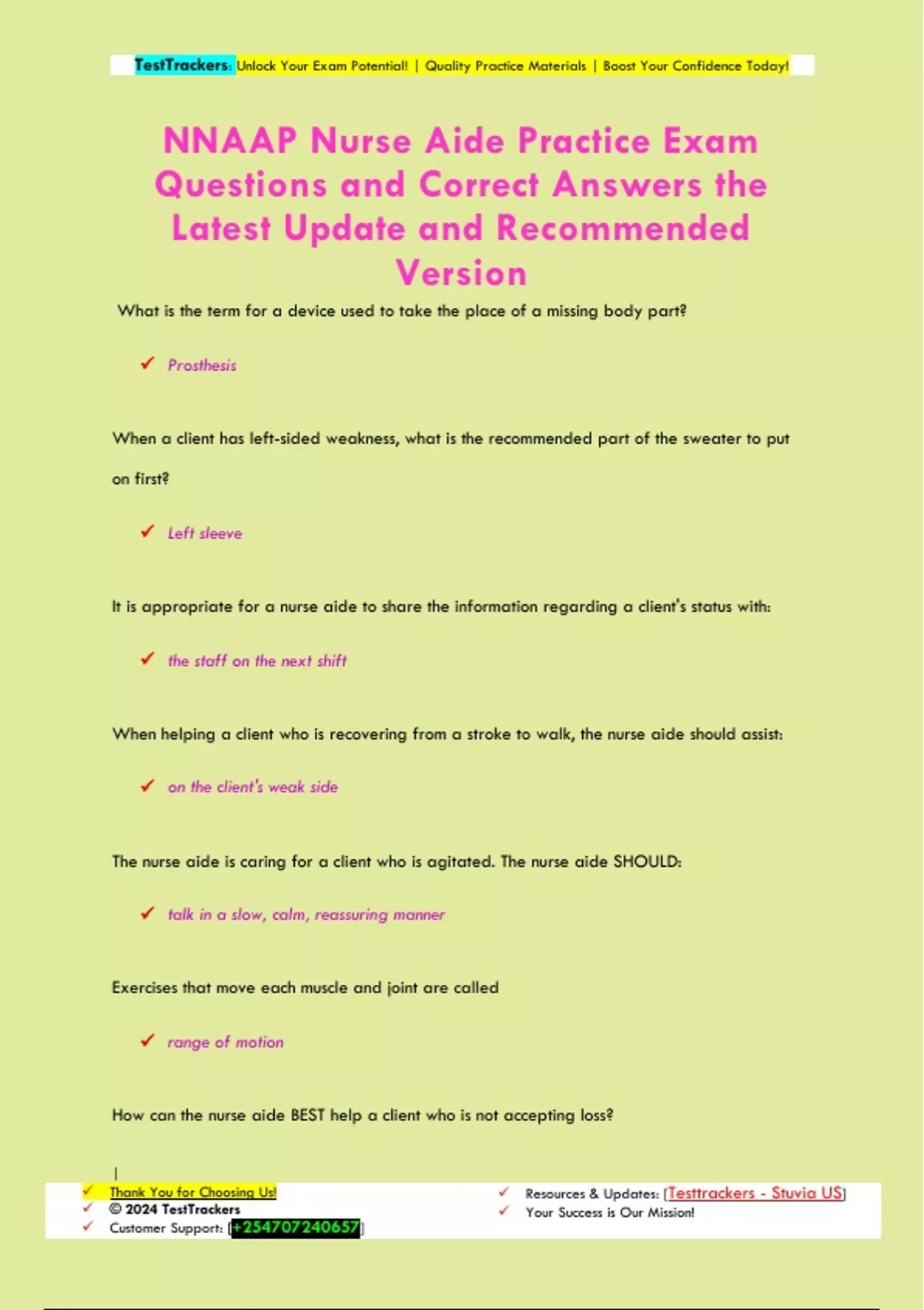 What is the term for a device used to take the place of a missing body part? Prosthesis When a client has left-sided weakness, what is the recommended part of the sweater to put on first? Left sleeve It is appropriate for a nurse aide to share the information regarding a client's status with: the staff on the next shift When helping a client who is recovering from a stroke to walk, the nurse aide should assist: on the client's weak side The nurse aide is caring for a client who is agitated. The nurse aide SHOULD: talk in a slow, calm, reassuring manner Exercises that move each muscle and joint are called range of motion How can the nurse aide BEST help a client who is not accepting loss? TestTrackers: Unlock Your Exam Potential! | Quality Practice Materials | Boost Your Confidence Today! | Thank You for Choosing Us! © 2024 TestTrackers Customer Support: [] Resources & Updates: [Testtrackers - Stuvia US] Your Success is Our Mission! Encourage the client to talk To BEST communicate with a client who is totally deaf, the nurse aide should write out information The nurse aide is asked by a confused client what day it is. The nurse aide should point to the date on the calendar and say the date To avoid pulling the catheter when turing a male client, the catheter tube must be taped to the client's upper thigh A nurse aide can assist clients with their spiritual needs by allowing clients to talk about their beliefs A nurse aide MUST wear gloves when: doing peri-care When getting ready to dress a client, the nurse aide SHOULD: give the client a choice of what to wear If the nurse aide discovers fire in a client's room, the FIRST thing to do is remove the client In order to communicate clearly with a client who has hearing loss, the nurse aide should: TestTrackers: Unlock Your Exam Potential! | Quality Practice Materials | Boost Your Confidence Today! | Thank You for Choosing Us! © 2024 TestTrackers Customer Support: [] Resources & Updates: [Testtrackers - Stuvia US] Your Success is Our Mission! look directly at the client when speaking Which of the following stages of dying usually is the final stage? Acceptance If a client says, "God is punishing me" or "Why me?", how should the nurse aide respond? Listen quietly The role of the ombudsman is to work with the nursing home to protect the clients' rights A nurse aide who is active in her church is assigned to care for a client who is not a member of any religious group. The nurse aide SHOULD respect the clients beliefs and avoid starting religious discussions The nurse aide notices that a client's mail has been delivered to the client's room. The nurse aide SHOULD give the client the unopened mail and offer help as needed Which of the following is a correct measurement of urinary output? 300 ml All of the following situat