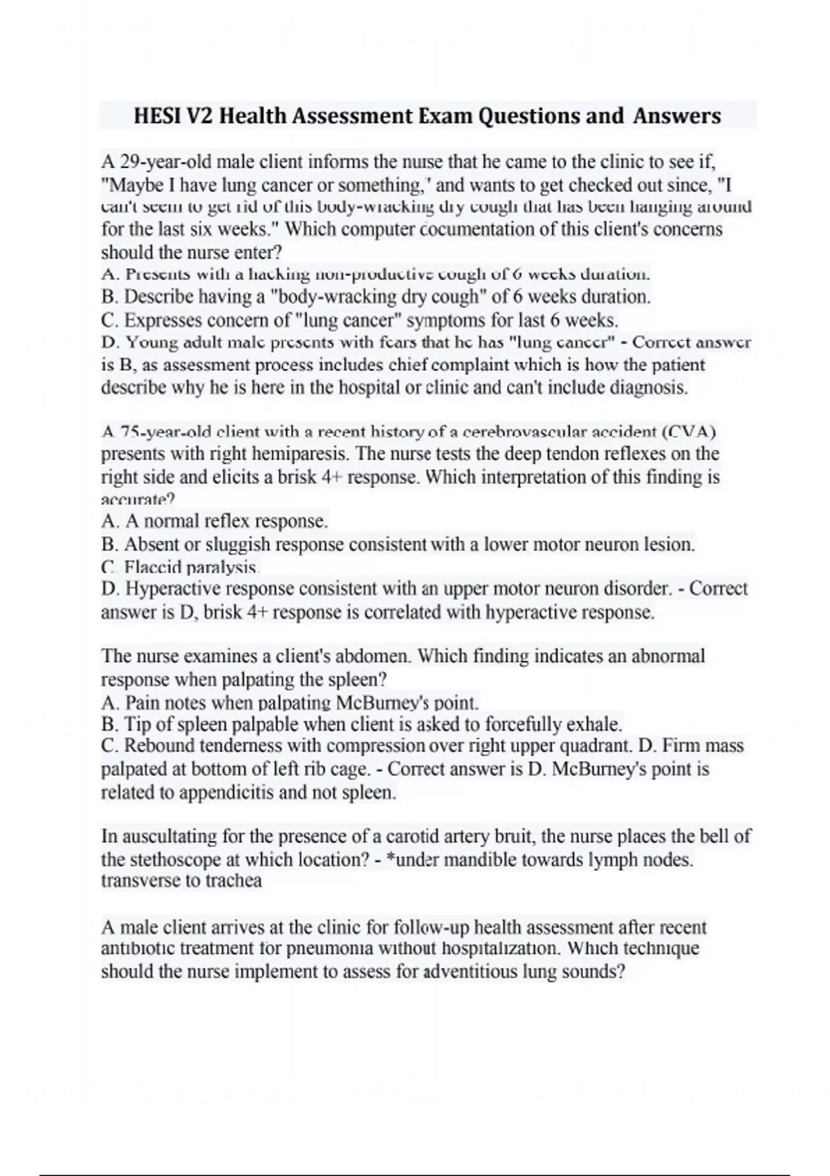 A 29-year-old male client informs the nurse that he came to the clinic to see if, "Maybe I have lung cancer or something," and wants to get checked out since, "I can't seem to get rid of this body-wracking dry cough that has been hanging around for the last six weeks." Which computer documentation of this client's concerns should the nurse enter? A. Presents with a hacking non-productive cough of 6 weeks duration. B. Describe having a "body-wracking dry cough" of 6 weeks duration. C. Expresses concern of "lung cancer" symptoms for last 6 weeks. D. Young adult male presents with fears that he has "lung cancer" - Correct answer is B, as assessment process includes chief complaint which is how the patient describe why he is here in the hospital or clinic and can't include diagnosis. A 75-year-old client with a recent history of a cerebrovascular accident (CVA) presents with right hemiparesis. The nurse tests the deep tendon reflexes on the right side and elicits a brisk 4+ response. Which interpretation of this finding is accurate? A. A normal reflex response. B. Absent or sluggish response consistent with a lower motor neuron lesion. C. Flaccid paralysis. D. Hyperactive response consistent with an upper motor neuron disorder. - Correct answer is D, brisk 4+ response is correlated with hyperactive response. The nurse examines a client's abdomen. Which finding indicates an abnormal response when palpating the spleen? A. Pain notes when palpating McBurney's point. B. Tip of spleen palpable when client is asked to forcefully exhale. C. Rebound tenderness with compression over right upper quadrant. D. Firm mass palpated at bottom of left rib cage. - Correct answer is D. McBurney's point is related to appendicitis and not spleen. In auscultating for the presence of a carotid artery bruit, the nurse places the bell of the stethoscope at which location? - *under mandible towards lymph nodes. transverse to trachea A male client arrives at the clinic for follow-up health assessment after recent antibiotic treatment for pneumonia without hospitalization. Which technique should the nurse implement to assess for adventitious lung sounds? A. Use the bell of the stethoscope to listen to the lung fields over lower lobes. B. Have the client lay flat while listening to the anterior surface of the chest. C. Press the stethoscope's diaphragm firmly on the skin over each lung field. D. Shave all chest hair that may distort sounds heard through the diaphragm. - Correct answer is C. The nurse should listen to all lungs fields during assessment and move from side to side during auscultation. A client with streptococcus pharyngitis reports high fever, difficulty swallowing and a muffled voice. Which complication should the nurse suspect? A. Foreign body obstruction. B. Laryngeal polyps. C. Peritonsillar abscess. D. Nasal polyps - Correct answer is C. Since infections are associated with abscesses and pus. The nurse is obtaining a health history for a client prior to a scheduled cholecystectomy. While interviewing the client, which assessment technique should the nurse use when asking about the client's use of illegal drugs and alcohol? A. Obtain a drug using screen to verify legitimacy of client's stated history. B. Allow the client to decline answering social questions. C. Ask specifically about alcohol, marijuana, cocaine, her D. Use the term illegal or illicit to describe street drug. - Correct answer is C. When interviewing the patient, questions should be clear and specific. The nurse applies pressure over an area of the lower abdomen where the client reports pain. The client denies pain upon palpation, but reports pain when the pressure is released. What action should the nurse implement? A. Offer to administer a laxative prescribed for PRN use. B. Obtain a prescription to catheterize the client's bladder. C. Instruct the client in distraction and relation techniques. D. Notify the healthcare provider of the rebound tenderness. - Correct answer is D. As this could be a sign of appendicitis. The nurse is assessing an ulcer on a client's lower extremity, which is likely the result of either venous or arterial insufficiency. Which assessment technique should the nurse use to differentiate the pathophysiology causing the ulcer? A. Measure the degree of join range of motion in the extremity. B. Compare the skin turgor of the client's upper and lower leg. C. Observe the specific location and appearance of the ulceration. D. Note any change in the color of the ulcer when the leg is moved - Correct answer is C. Location and appearance of the ulcer would give us the type (venous vs arterial) The nurse is conducting a physical assessment of a young adult. Which information provides the best indication of the individual's nutritional status? A. Status of current appetite. B. A 24-hour diet history. C. History of a recent weight loss. D. Condition of hair, nails, and skin. - Correct answer is D. Hair, nail, and skin are the most important reflection of nutritional status. The nurse is assessing a healthy adult male during an annual physical examination. The nurse auscultates the client's abdomen and hears gurgling sound every ten seconds. What action should the nurse take in response to this finding? A. Document this normal bowel sound activity in the record. B. Encourage increased consumption of fiber in the diet. C. Observe the next bowel movement for signs of bleeding. D. Report the hyperactivity to the healthcare provider. - Correct answer is A. Normal Bowel sound consist of clicks and gurgles and 5-30 per minute. An occasional borborygmus (Loud prolonged gurgle) may be hear. In observing a client's face, which assessment finding requires the most immediate intervention by the nurse? A. Eyelids are matted and crusted. B. Cornea are jaundiced. C. Oral mucosa is cyanotic. D. Face is flushed and diaphoretic. - Answer is C. Blue lips occur when the skin on the lips takes on a bluish tint or color. This generally is due 