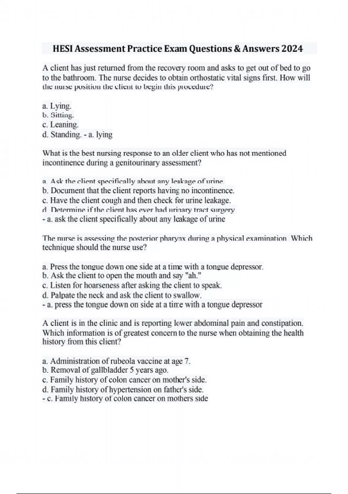 A client has just returned from the recovery room and asks to get out of bed to go to the bathroom. The nurse decides to obtain orthostatic vital signs first. How will the nurse position the client to begin this procedure? a. Lying. b. Sitting. c. Leaning. d. Standing. - a. lying What is the best nursing response to an older client who has not mentioned incontinence during a genitourinary assessment? a. Ask the client specifically about any leakage of urine. b. Document that the client reports having no incontinence. c. Have the client cough and then check for urine leakage. d. Determine if the client has ever had urinary tract surgery. - a. ask the client specifically about any leakage of urine The nurse is assessing the posterior pharynx during a physical examination. Which technique should the nurse use? a. Press the tongue down one side at a time with a tongue depressor. b. Ask the client to open the mouth and say "ah." c. Listen for hoarseness after asking the client to speak. d. Palpate the neck and ask the client to swallow. - a. press the tongue down on side at a time with a tongue depressor A client is in the clinic and is reporting lower abdominal pain and constipation. Which information is of greatest concern to the nurse when obtaining the health history from this client? a. Administration of rubeola vaccine at age 7. b. Removal of gallbladder 5 years ago. c. Family history of colon cancer on mother's side. d. Family history of hypertension on father's side. - c. Family history of colon cancer on mothers side What is the best place for the nurse to hear lower lobe lung sounds with a stethoscope? a. Posterior chest below the 3rd intercostal space. b. Posterior-axillary line at the 4th intercostal space. c. Anterior chest at the level of the 4th intercostal space. d. Anterior-axillary line at the 5th intercostal space. - a. Posterior chest below the 3rd intercostal space A client with progressive hearing loss appears distressed when the registered nurse (RN) asks open-ended questions about the client's health history. Which forms of communication should the RN use? a. Face the client so the client can see the RN's mouth. b. Increase one's speech volume when interacting with the client. c. Repeat information to the client if misunderstood. d. Check if the client's hearing aides are working properly. e. Reduce environmental noise surrounding the client. - a. Face client so client can see mouth d. check if clients hearing aides are working properly e. reduce environmental noise The nurse is assessing a client who has experienced a sudden onset of hearing loss in the right ear. Which finding should alert the nurse to a potentially serious medical condition that requires further evaluation? a. The client works in a busy office setting. b. There is no sign of associated infection. c. The client has no prior history of hearing loss. d. The hearing loss involves high frequencies. - b. there is no sign of associated infection Which findings can the nurse determine by palpating a client's skin? (Select all that apply.) a. Pruritus. b. Diaphoresis. c. Pallor. d. Jaundice. e. Scaling. - b. Diaphoresis e. Scaling The nurse is interviewing a client who reports having a persistent, productive cough during the winter caused by bronchitis. Which additional finding should the nurse assess for bronchitis? a. Phlegm production and wheezing. b. Smoking history. c. Hemoptysis. d. Night sweats. - a. Phlegm production and wheezing The nurse is assessing a client for a hip flexion contracture. Which finding indicates a negative Thomas test when the client's right knee is brought toward the chest? a. The left leg internally rotates. b. The left leg rises off of the table. c. The left leg remains on the table. d. The left leg externally rotates. - c. the eft leg remains on the table The nurse is assessing a client with liver disease who is jaundice and exhibits scleral edema. During the health assessment, the nurse should implement which technique to determine evidence of hepatomegaly? a. Tap the liver's boundaries lightly with a percussion hammer to produce a sound. b. Push gently using fingers of both hands to determine the boundaries of the liver. c. Use a bouncing motion to tap the middle finger placed within boundaries of the liver. d. Cup hands and clap with alternating contact with the skin over regions of the liver. - c. use a bouncing motion to tap the middle finger paced within boundaries of the liver The client is experiencing severe pruritus and small papules and burrows on areas over one hand and the inner thighs. Which assessment data best explains the condition the client is experiencing? a. The client works in a daycare setting that has had a scabies outbreak. b. The client has been using a chemical stripping agent for home remodeling. c. The client has a family history of psoriasis in both parents and a sibling. d. The client routinely works with clay and paint as a hobby. - a. the client works in a daycare setting that had a scabies outbreak While assessing level of consciousness, the nurse finds that a client localizes to pain, is confused during conversation, and opens the eyes to sound. How should the nurse document the Glasgow score of this client? a. 12. b. 10. c. 9. d. 7. - a. 12 The client reports to the nurse a recent exposure to the mumps. Which assessment finding suggests the client has contracted the mumps? a. Enlargement centered along the anterior lower neck region. b. Swelling anterior to the ear lobe on one side of the face. c. Generalized rounded shape of the face. d. Paralysis on one side of the face. - b. swelling anterior to the ear lobe on one side of the face The nurse is assessing a client who has a history of aortic regurgitation. Where should the nurse place the stethoscope diaphragm to listen for this condition? a. 2nd intercostal space along the right sternal border. b. 2nd intercostal space along the left sternal border. c. 3rd intercostal space on the right m