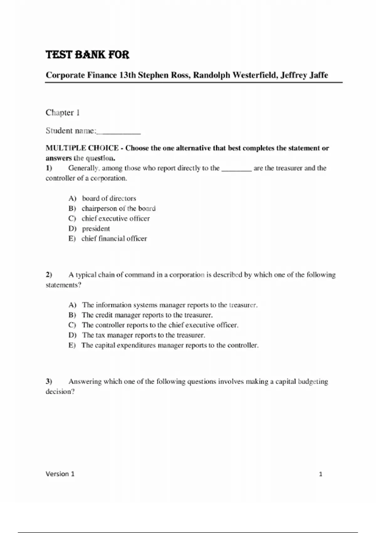 Test Bank for Corporate Finance 13th Edition Stephen Ross, Randolph Westerfield, Jeffrey Jaffe Complete Guide. Chapter 1 Student name:__________ MULTIPLE CHOICE - Choose the one alternative that best completes the statement or answers the question. 1) Generally, among those who report directly to the ________ are the treasurer and the controller of a corporation. A) board of directors B) chairperson of the board C) chief executive officer D) president E) chief financial officer 2) A typical chain of command in a corporation is described by which one of the following statements? A) The information systems manager reports to the treasurer. B) The credit manager reports to the treasurer. C) The controller reports to the chief executive officer. D) The tax manager reports to the treasurer. E) The capital expenditures manager reports to the controller. 3) Answering which one of the following questions involves making a capital budgeting decision? Version 1 2 A) How much debt should the firm borrow from a particular lender? B) Should the firm build a new production facility? C) Should the firm issue new equity to pay for its growth goals? D) How much inventory should the firm keep on hand? E) How much credit should the firm extend to a particular customer? 4) Which one of the following statements is accurate? A) Net working capital equals current assets plus current liabilities. B) Current liabilities are debts that must be repaid in 18 months or less. C) Current assets are assets with short lives, such as accounts receivable. D) Long-term debt is defined as a residual claim on a firm’s assets. E) Tangible assets are fixed assets such as patents. 5) Among the typical responsibilities of the corporate controller is: A) capital expenditures management. B) cash management. C) tax reporting. D) financial planning. E) credit management. 6) ________ is typically the responsibility of the corporate treasurer. A) Financial planning B) Cost accounting C) Tax reporting D) Information systems E) Financial accounting 7) A firm’s ________ define(s) its capital structure. Version 1 3 A) mixture of various types of production equipment B) investment selections for its excess cash reserves C) combination of cash and cash equivalents D) combination of accounts appearing on the left side of its balance sheet E) proportions of financing from debt and equity 8) The focus of short-term finance is on: A) the timing of cash flows. B) acquiring and selling fixed assets. C) financing long-term projects. D) capital budgeting. E) issuing additional shares of common stock. 9) Net working capital includes: A) copyrights. B) manufacturing equipment. C) common stock. D) long-term debt. E) inventory. 10) ________ is defined as planning and managing a firm’s long-term assets. A) Working capital management B) Cash management C) Cost accounting management D) Capital budgeting E) Capital structure management 11) An amount the firms owes, which it must repay within twelve months, is called a(n): Version 1 4 A) current liability. B) long-term debt. C) intangible asset. D) accounts receivable. E) current asset. 12) The business entity that is typically the least expensive to form is the: A) limited liability company. B) joint stock company. C) general partnership. D) limited partnership. E) sole proprietorship. 13) A ________ is a business owned by a single individual. A) corporation B) sole proprietorship C) general partnership D) limited partnership E) limited liability company 14) Regarding a sole proprietorship, which one of the following statements is accurate? A) It is more difficult to form than other forms of business. B) Its business profits are taxed twice at the federal level. C) Its business profits are taxed separately from the personal income of the owner. D) The owner may be forced to sell his or her personal assets to pay the company's debts. E) It has an unlimited life span. 15) Regarding a sole proprietorship, which one of the following statements is accurate? Version 1 5 A) The ability to raise capital is limited by the owner’s personal wealth. B) It pays taxes at the corporate tax rate. C) Ownership of the firm is easy to transfer to another individual. D) It must pay income taxes separately from the taxes paid by the owner. E) The legal costs to form it are usually substantial. 16) The primary advantage of being a limited partner rather than a general partner is: A) being entitled to a larger portion of the partnership’s income. B) having responsibility for day-to-day management of the business. C) earning profits that are free from income taxation. D) the ability to have overall control of the partnership. E) one’s personal financial liability is limited to the amount of capital invested. 17) A general partner: A) has less legal liability than a limited partner. B) can end the partnership by withdrawing. C) faces double taxation of profits whereas a limited partner does not. D) cannot lose more than the amount of his or her equity investment. E) is the term applied only to corporations that invest in partnerships. 18) A partnership: A) is taxed in the same fashion that a corporation is taxed. B) terminates upon the death of any limited partner. C) creates for all general partners an unlimited liability for the partnership's debts. D) has the same ability as a corporation to raise capital. E) allows for easy transfer of ownership from one general partner to another. 19) One advantage of a partnership is the: Version 1 6 A) personal liability for all of the firm’s debts. B) limited life of the entity. C) limited liability protection for all of the partners. D) relatively low cost of formation. E) ease of transferring full ownership to others. 20) One disadvantage of the corporate form of business ownership is the: A) limited liability protection provided for all owners. B) firm’s ability to raise cash. C) unlimited life of the firm. D) difficulties encountered when changing ownership. E) double t