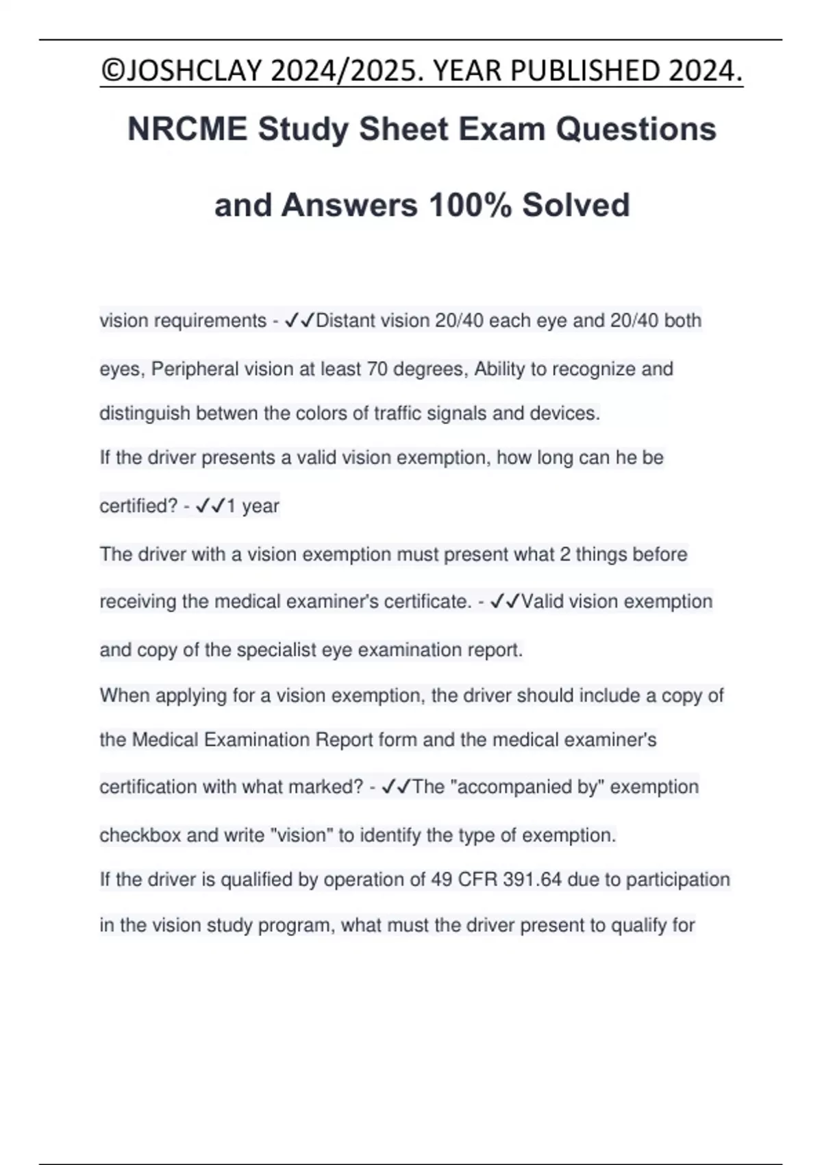 NRCME Study Sheet Exam Questions