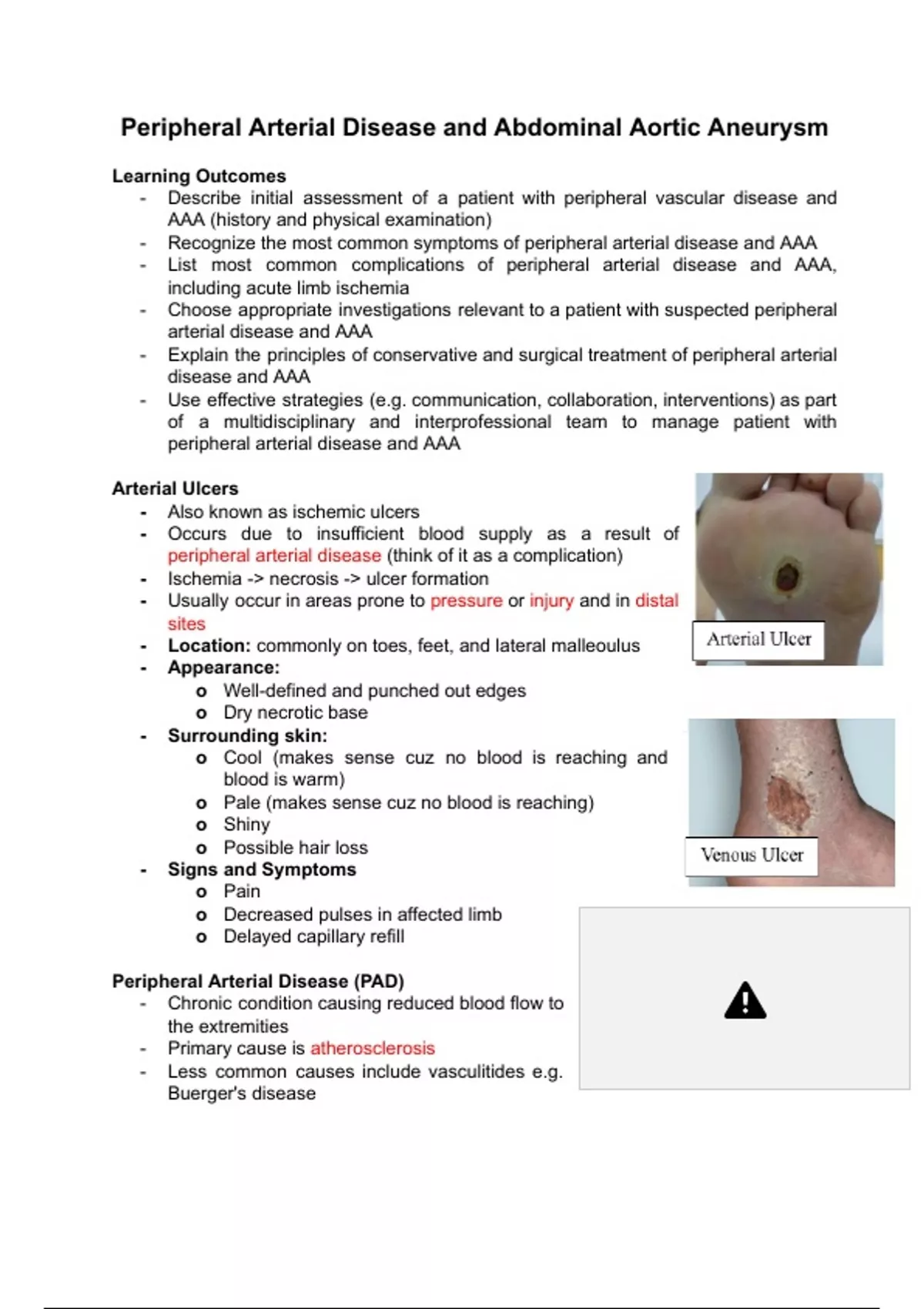 - Recognize the most common symptoms of peripheral arterial disease and AAA