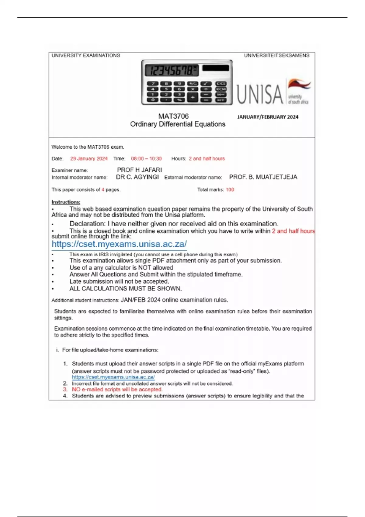 This document contains the final exam for APM3706, Ordinary Differential Equations, for the January-February 2024 session.