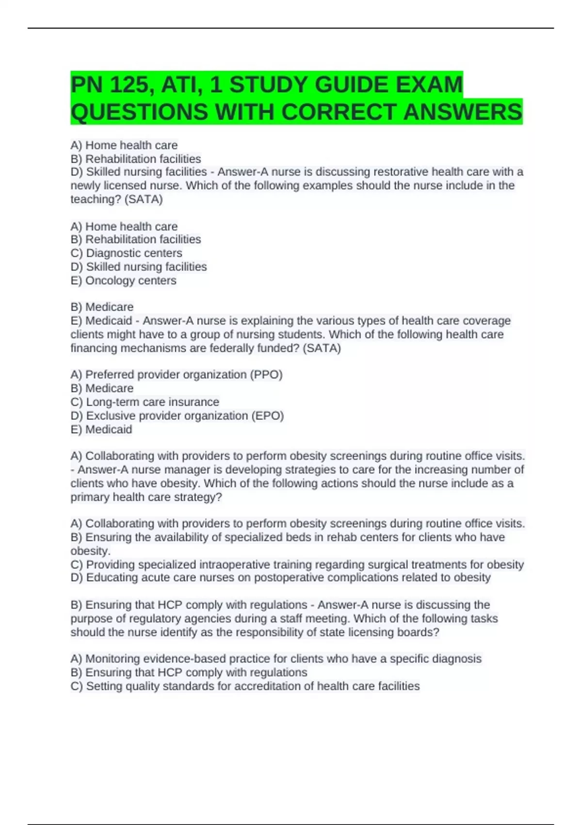 PN 125, ATI, 1 STUDY GUIDE EXAM QUESTIONS WITH CORRECT ANSWERS