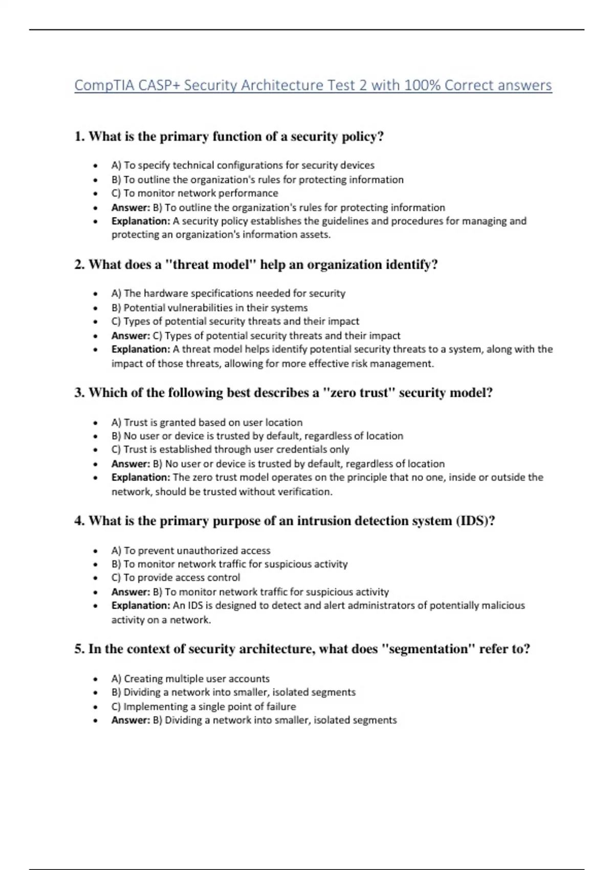 • Explanation: A security policy establishes the guidelines and procedures for managing and