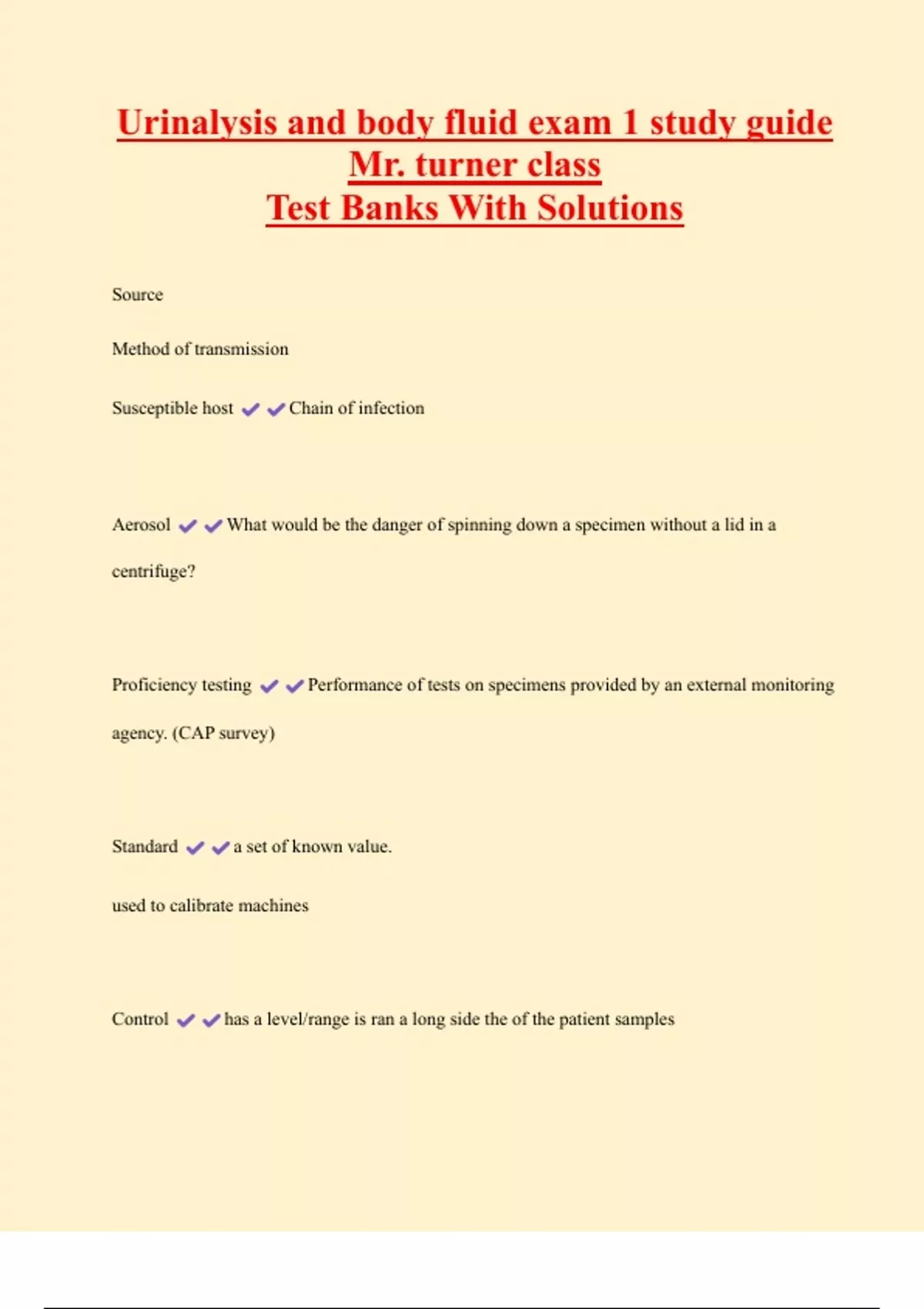 Urinalysis and body fluid exam 1 study guide Mr. turner class Test Banks With Solutions