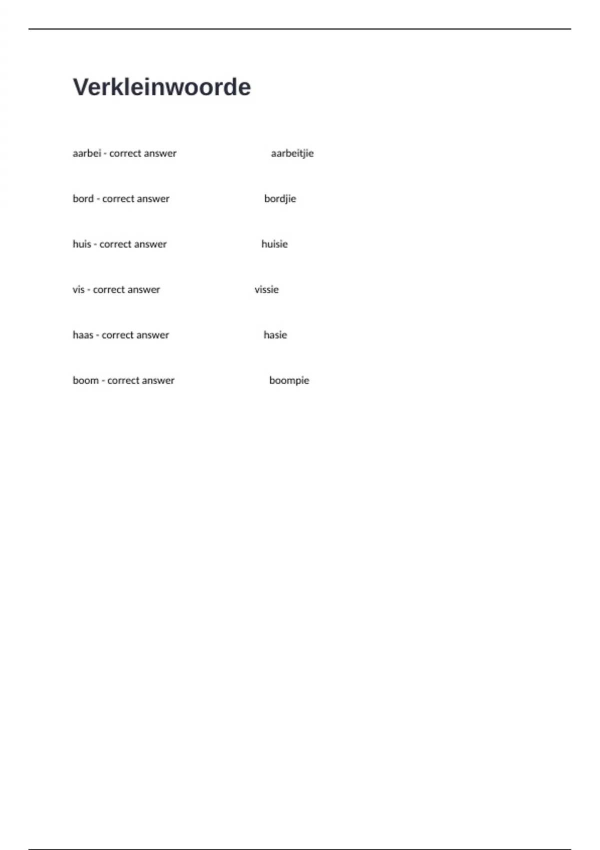 aarbei - correct answer aarbeitjie bord - correct answer bordjie huis - correct answer huisie vis - correct answer vissie haas - correct answer hasie boom - correct answer boompie