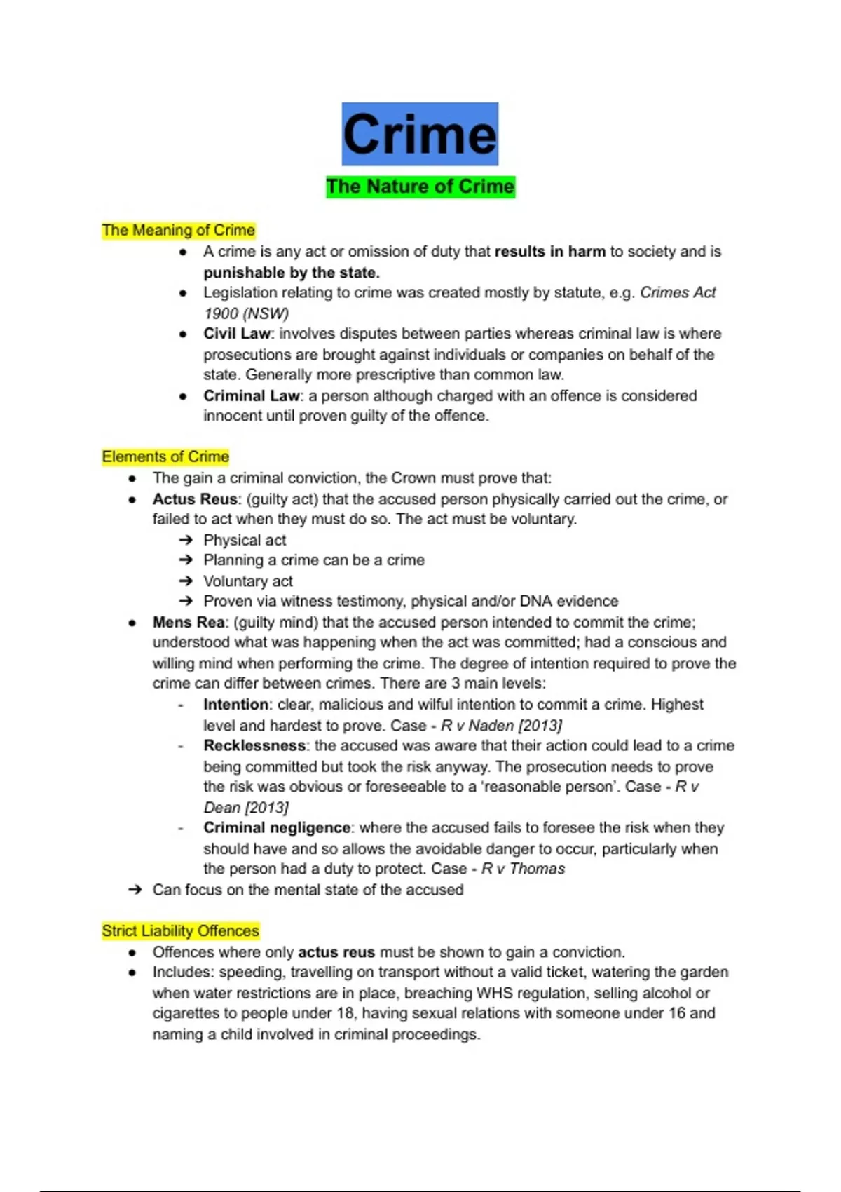 ● Legislation relating to crime was created mostly by statute, e.g. Crimes Act