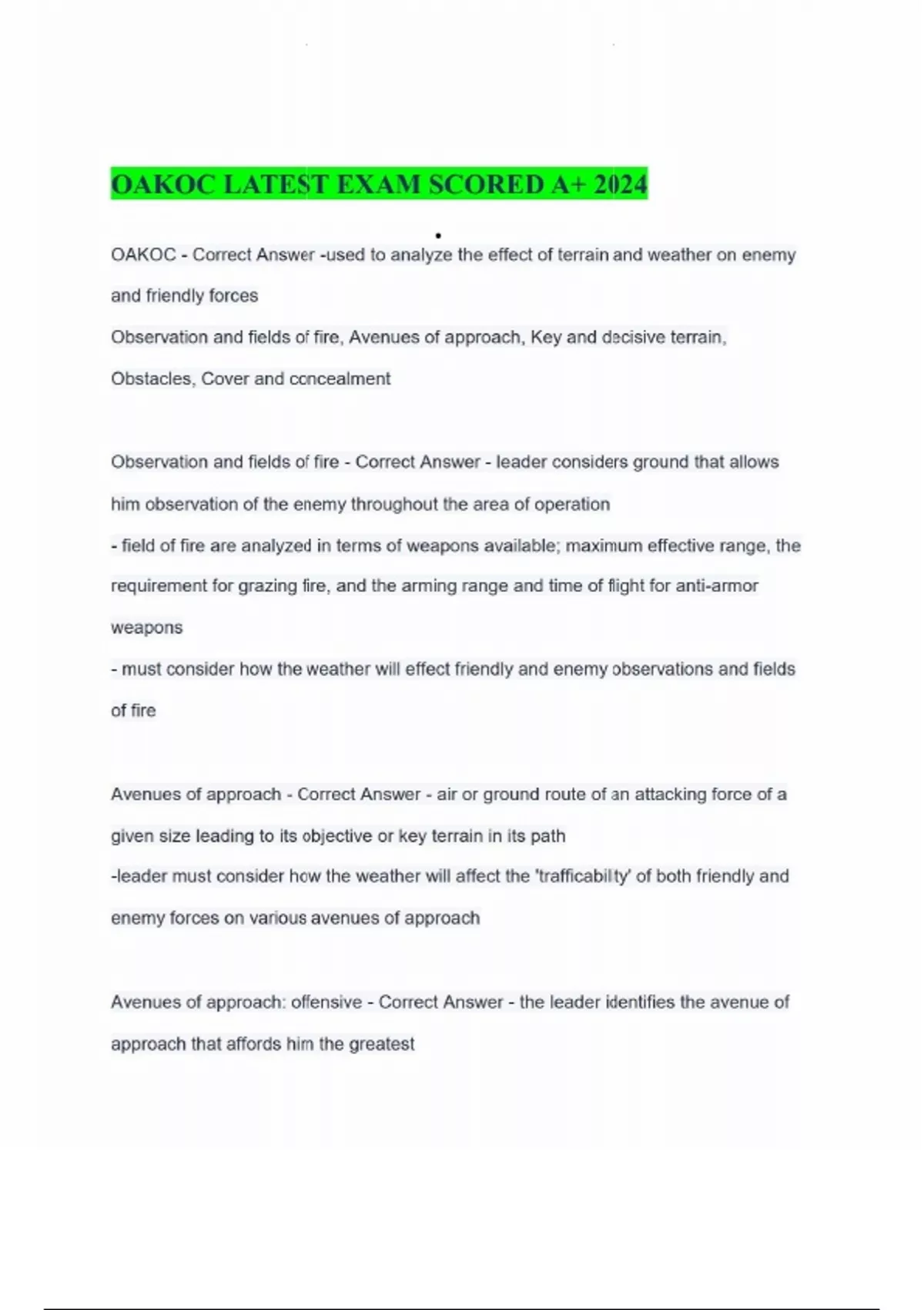 OAKOC LATEST EXAM SCORED A+ 2024 • OAKOC - Correct Answer -used to analyze the effect of terrain and weather on enemy and friendly forces Observation and fields of fire, Avenues of approach, Key and decisive terrain, Obstacles, Cover and concealment Observation and fields of fire - Correct Answer - leader considers ground that allows him observation of the enemy throughout the area of operation - field of fire are analyzed in terms of weapons available; maximum effective range, the requirement for grazing fire, and the arming range and time of flight for anti-armor weapons - must consider how the weather will effect friendly and enemy observations and fields of fire Avenues of approach - Correct Answer - air or ground route of an attacking force of a given size leading to its objective or key terrain in its path -leader must consider how the weather will affect the 'trafficability' of both friendly and enemy forces on various avenues of approach Avenues of approach: offensive - Correct Answer - the leader identifies the avenue of approach that affords him the greatest