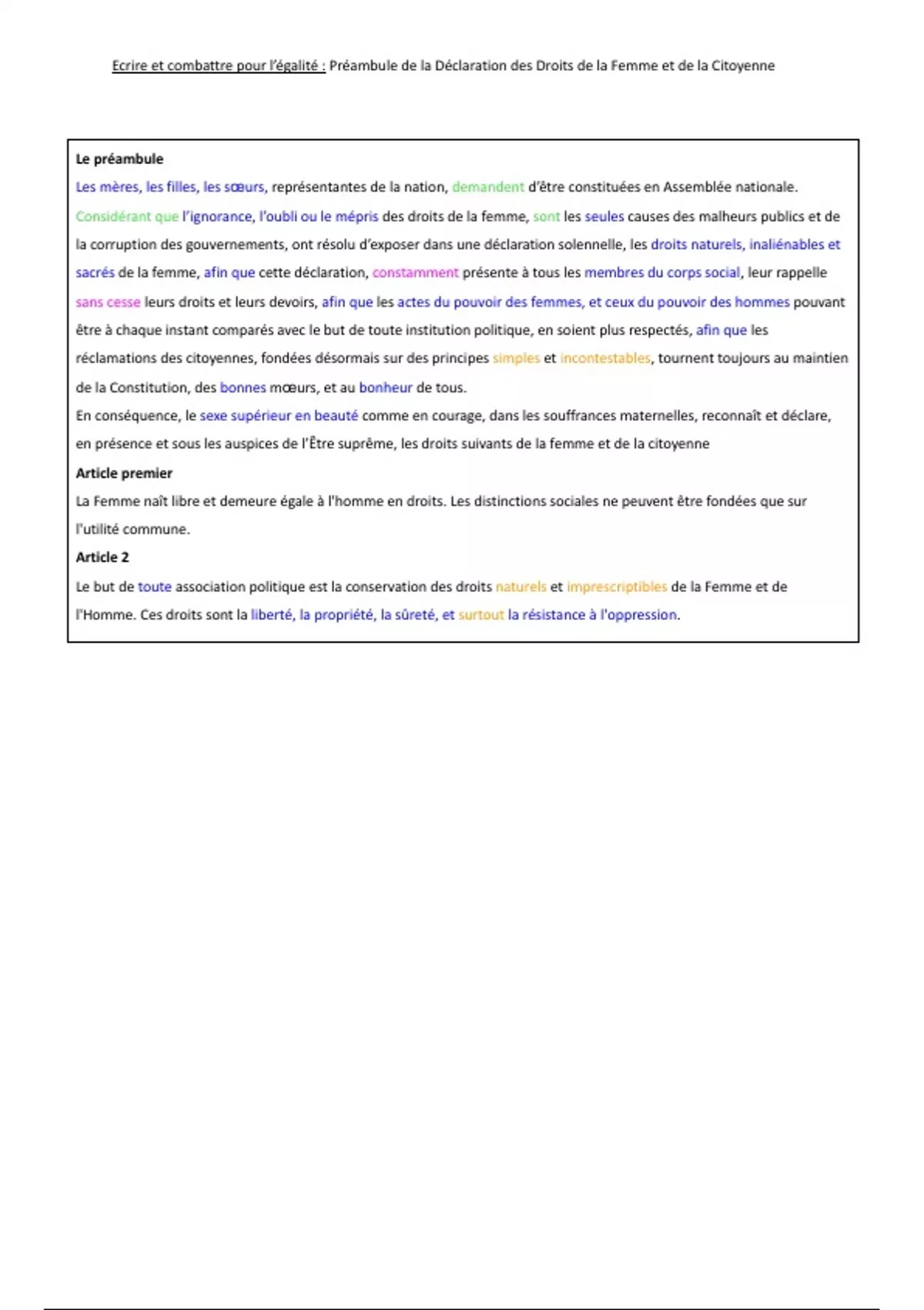 Analyse linéaire du préambule de la Déclaration des Droits de la Femme et de la Citoyenne