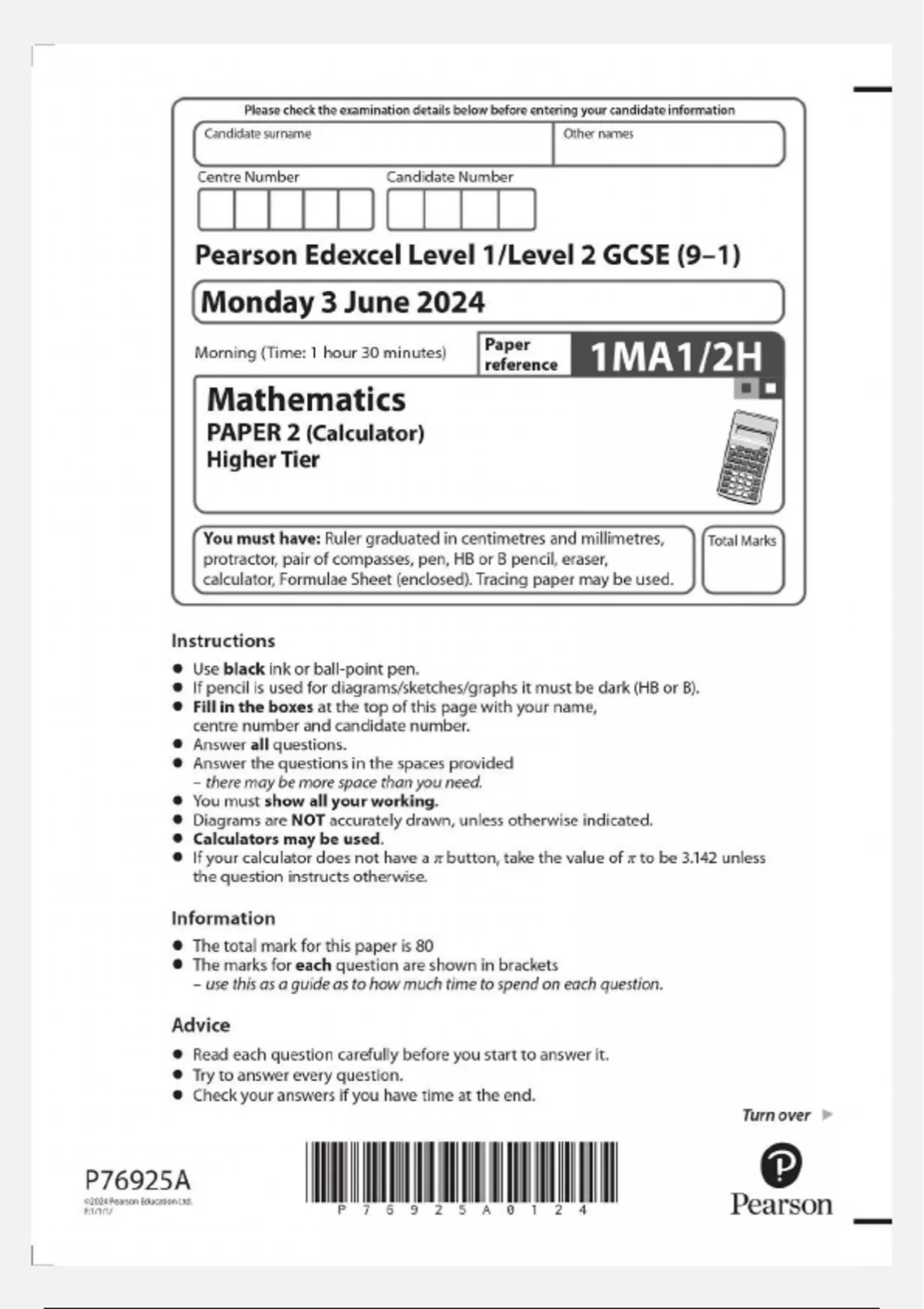 Edexcel GCSE May 2024 Higher Mathematics Paper 2 (Calculator) 1MA1/2H