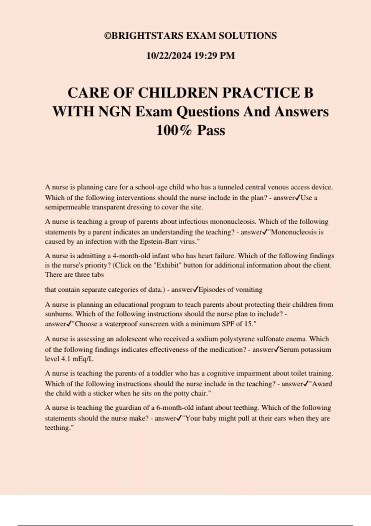 ©BRIGHTSTARS EXAM SOLUTIONS 10/22/2024 19:29 PM CARE OF CHILDREN PRACTICE B WITH NGN Exam Questions And Answers 100% Pass A nurse is planning care for a school-age child who has a tunneled central venous access device. Which of the following interventions should the nurse include in the plan? - answerUse a semipermeable transparent dressing to cover the site. A nurse is teaching a group of parents about infectious mononucleosis. Which of the following statements by a parent indicates an understanding the teaching? - answer"Mononucleosis is caused by an infection with the Epstein-Barr virus." A nurse is admitting a 4-month-old infant who has heart failure. Which of the following findings is the nurse's priority? (Click on the "Exhibit" button for additional information about the client. There are three tabs that contain separate categories of data.) - answerEpisodes of vomiting A nurse is planning an educational program to teach parents about protecting their children from sunburns. Which of the following instructions should the nurse plan to include? - answer"Choose a waterproof sunscreen with a minimum SPF of 15." A nurse is assessing an adolescent who received a sodium polystyrene sulfonate enema. Which of the following findings indicates effectiveness of the medication? - answerSerum potassium level 4.1 mEq/L A nurse is teaching the parents of a toddler who has a cognitive impairment about toilet training. Which of the following instructions should the nurse include in the teaching? - answer"Award the child with a sticker when he sits on the potty chair." A nurse is teaching the guardian of a 6-month-old infant about teething. Which of the following statements should the nurse make? - answer"Your baby might pull at their ears when they are teething." ©BRIGHTSTARS EXAM SOLUTIONS 10/22/2024 19:29 PM A nurse is assessing the pain level of a 3-year-old toddler. Which of the following pain assessment scales should the nurse use? - answerfaces A charge nurse is preparing to make a room assignment for a newly admitted school-age child. Which of the following considerations is the nurse's priority? - answerdisease process A nurse is caring for a preschooler who was recently admitted to a pediatric unit; The nurse is reviewing the information in the child's electronic medical record (EMR). For each EMR finding, click to specify if the finding is consistent with nephrotic syndrome, acute poststreptococcal glomerulonephritis, or hemolytic uremic syndrome. Each finding may support more than one disease process. - answerNephrotic Syndrome- BP, Cholesterol APG- temp, BUN, BP HUS- temp, BUN, platelet, BP A nurse is assessing a 6-month-old infant during a well-child visit. Which of the following findings should the nurse report to the provider? - answerPresence of strabismus A nurse is assessing an 8-year-old child who has early indications of shock. After establishing an airway and stabilizing the child's respirations, which of the following actions should the nurse take next? - answerInitiate IV access A nurse is providing anticipatory guidance to the parent of a toddler. Which of the following expected behavior characteristics of toddlers should the nurse include? - answerExpressed likes and dislikes A nurse is teaching a school-age child and their parent about postoperative care following cardiac catheterization. Which of the following instructions should the nurse include? - answer"Wait 3 days before taking a tub bath." A nurse is providing discharge teaching to the parents of a 6-month-old infant who is postoperative following hypospadias repair with a stent placement. Which of the following instructions should the nurse include in the teaching? - answer"Allow the stent to drain into your infants diaper." A nurse is caring for a newly admitted school-age child who has hypopituitarism. Which of the following medications should the nurse expect the provider to prescribe? - answerRecombinant growth hormone A nurse in a pediatric emergency department is planning care for an adolescent. Based on the information in the adolescent's medical record, which of the following actions should the nurse
