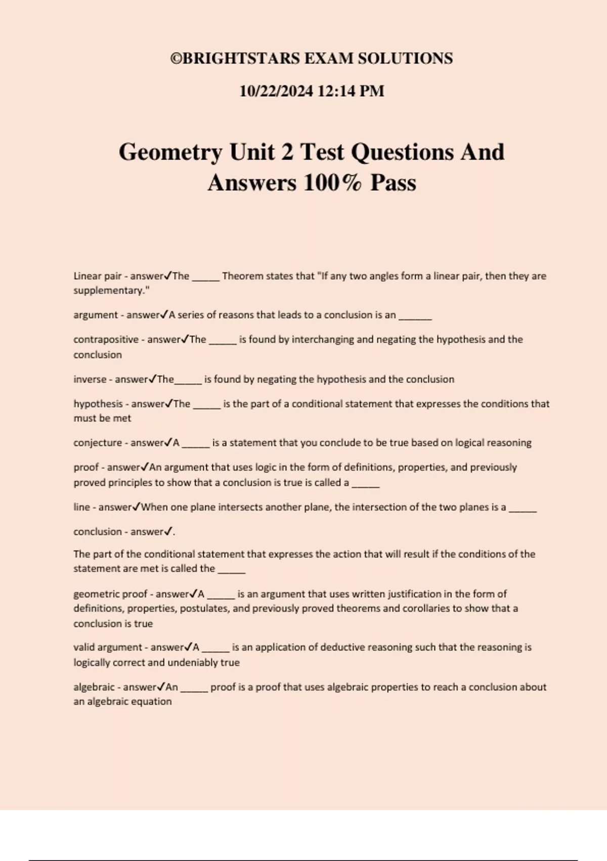 Geometry Unit 2 Test Questions And Answers 100% Pass Linear pair - answerThe _____ Theorem states that "If any two angles form a linear pair, then they are supplementary." argument - answerA series of reasons that leads to a conclusion is an ______ contrapositive - answerThe _____ is found by interchanging and negating the hypothesis and the conclusion inverse - answerThe_____ is found by negating the hypothesis and the conclusion hypothesis - answerThe _____ is the part of a conditional statement that expresses the conditions that must be met conjecture - answerA _____ is a statement that you conclude to be true based on logical reasoning proof - answerAn argument that uses logic in the form of definitions, properties, and previously proved principles to show that a conclusion is true is called a _____ line - answerWhen one plane intersects another plane, the intersection of the two planes is a _____ conclusion - answer. The part of the conditional statement that expresses the action that will result if the conditions of the statement are met is called the _____ geometric proof - answerA _____ is an argument that uses written justification in the form of definitions, properties, postulates, and previously proved theorems and corollaries to show that a conclusion is true valid argument - answerA _____ is an application of deductive reasoning such that the reasoning is logically correct and undeniably