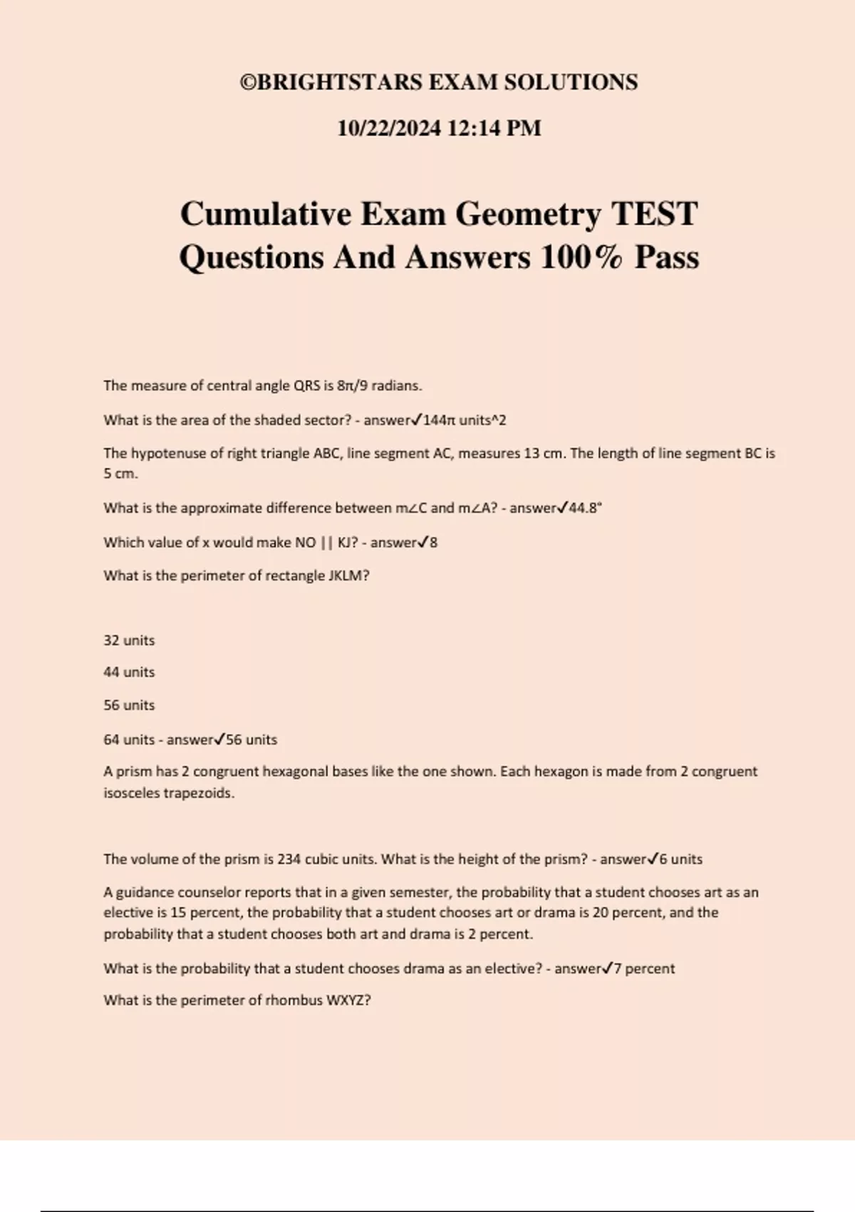 Cumulative Exam Geometry TEST Questions And Answers 100% Pass