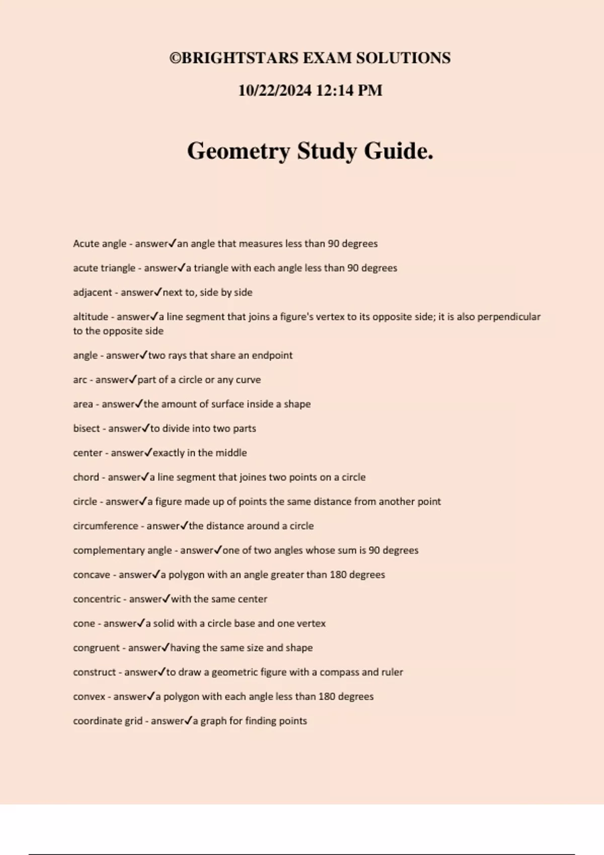 ©BRIGHTSTARS EXAM SOLUTIONS 10/22/2024 12:14 PM Geometry Study Guide. Acute angle - answeran angle that measures less than 90 degrees acute triangle - answera triangle with each angle less than 90 degrees adjacent - answernext to, side by side altitude - answera line segment that joins a figure's vertex to its opposite side; it is also perpendicular to the opposite side angle - answertwo rays that share an endpoint arc - answerpart of a circle or any curve area - answerthe amount of surface inside a shape bisect - answerto divide into two parts center - answerexactly in the middle chord - answera line segment that joines two points on a circle circle - answera figure made up of points the same distance from another point circumference - answerthe distance around a circle complementary angle - answerone of two angles whose sum is 90 degrees concave - answera polygon with an angle greater than 180 degrees concentric - answerwith the same center cone - answera solid with a circle base and one vertex congruent - answerhaving the same size and shape construct - answerto draw a geometric figure with a compass and ruler convex - answera polygon with each angle less than 180 degrees coordinate grid - answera graph for finding points