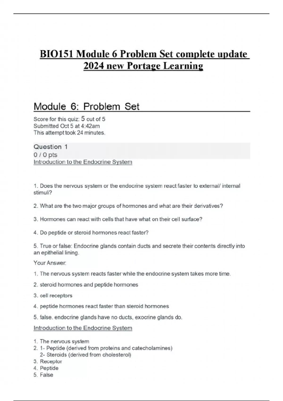 BIO151 Module 6 Problem Set complete update 2024 new Portage Learning Module 6: Problem Set Score for this quiz: 5 out of 5 Submitted Oct 5 at 4:42am This attempt took 24 minutes. Introduction to the Endocrine System 1. Does the nervous system or the endocrine system react faster to external/ internal stimuli? 2. What are the two major groups of hormones and what are their derivatives? 3. Hormones can react with cells that have what on their cell surface? 4. Do peptide or steroid hormones react faster? 5. True or false: Endocrine glands contain ducts and secrete their contents directly into an epithelial lining. Your Answer: 1. The nervous system reacts faster while the endocrine system takes more time. 2. steroid hormones and peptide hormones 3. cell receptors 4. peptide hormones react faster than steroid hormones 5. false. endocrine glands have no ducts, exocrine glands do. Introduction to the Endocrine System 1. The nervous system 2. 1- Peptide (derived from proteins and catecholamines) 2- Steroids (derived from cholesterol) 3. Receptor 4. Peptide 5. False Question 2