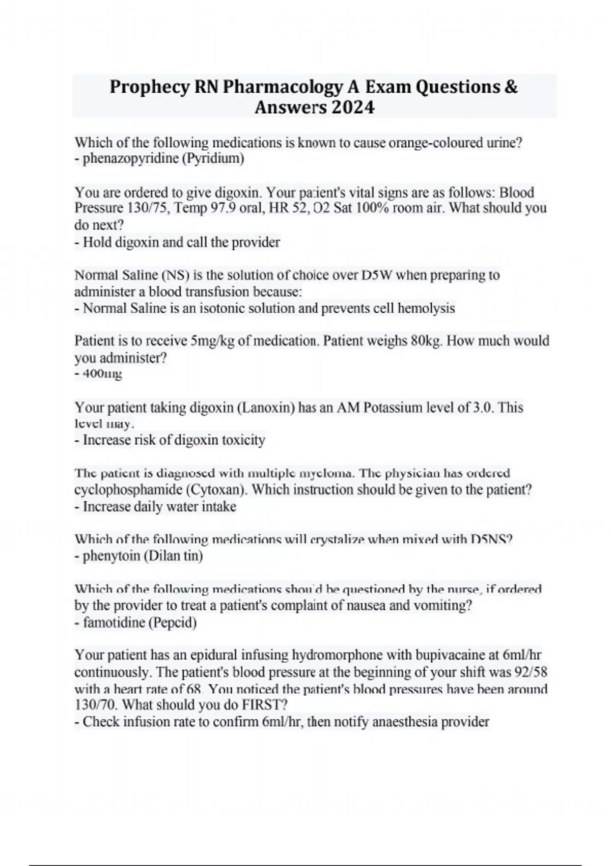 Which of the following medications is known to cause orange-coloured urine? - phenazopyridine (Pyridium) You are ordered to give digoxin. Your patient's vital signs are as follows: Blood Pressure 130/75, Temp 97.9 oral, HR 52, O2 Sat 100% room air. What should you do next? - Hold digoxin and call the provider Normal Saline (NS) is the solution of choice over D5W when preparing to administer a blood transfusion because: - Normal Saline is an isotonic solution and prevents cell hemolysis Patient is to receive 5mg/kg of medication. Patient weighs 80kg. How much would you administer? - 400mg Your patient taking digoxin (Lanoxin) has an AM Potassium level of 3.0. This level may: - Increase risk of digoxin toxicity The patient is diagnosed with multiple myeloma. The physician has ordered cyclophosphamide (Cytoxan). Which instruction should be given to the patient? - Increase daily water intake Which of the following medications will crystalize when mixed with D5NS? - phenytoin (Dilan tin) Which of the following medications should be questioned by the nurse, if ordered by the provider to treat a patient's complaint of nausea and vomiting? - famotidine (Pepcid) Your patient has an epidural infusing hydromorphone with bupivacaine at 6ml/hr continuously. The patient's blood pressure at the beginning of your shift was 92/58 with a heart rate of 68. You noticed the patient's blood pressures have been around 130/70. What should you do FIRST? - Check infusion rate to confirm 6ml/hr, then notify anaesthesia provider Prophecy RN Pharmacology A Exam Questions & Answers 2024 The dosage of which drug must be tapered off slowly to prevent acute adrenal insufficiency? - prednisone (Deltasone) When teaching a new nurse on how to administer IV push furosemide (Lasix), you emphasize that it should be given over two minutes to avoid: - tinnitus A nurse is caring for a patient with hyperparathyroidism and notes that the patient's serum calcium level is 13mg/dl. Which medication should the nurse prepare to administer as prescribed to the patient? - calcitonin (Miacalcin) A patient has a prescription to take Guaifenesin (Mucinex) every 4 hours, as needed. The nurse determines that the patient understands the MOST effective use of the medication if the patient states that he or she will: - take the medication with a full glass of water Acetylsalicylic acid (Aspirin) has which of the following pharmacological effects? - Anti-inflammatory, anti-pyretic, decrease platelet aggregation Your patient is to receive 2 G vancomycin over 2 hours. The medication comes in from the pharmacy as 2 G Vancomycin in 250ml normal saline. At what rate will the IV medication run? - 125ml/hr Sildenafil (Viagra) is prescribed to treat a patient with erectile dysfunction. A nurse reviews the patient's medical record and would question the prescription if which of the following is noted in the history? - Use of nitroglycerin While delivering the lunch tray of a patient who is taking warfarin (Coumadin), the nurse notices diversity of food items. Which of the following foods would be a concern? - Spinach Your patient is receiving vancomycin (Vancocin) 500mg IV every 12 hours. As a nurse, you understand that the PRIMARY rationale for monitoring serum levels of vancomycin is that: - It can cause nephrotoxicity