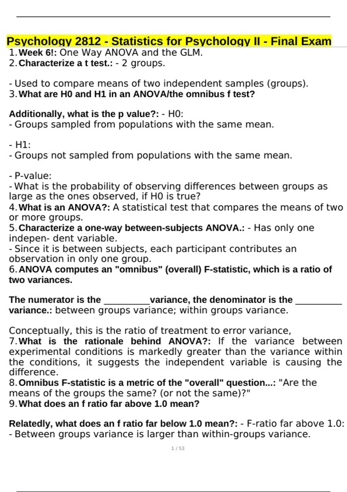 Psychology 2812 - Statistics for Psychology II - Final Exam