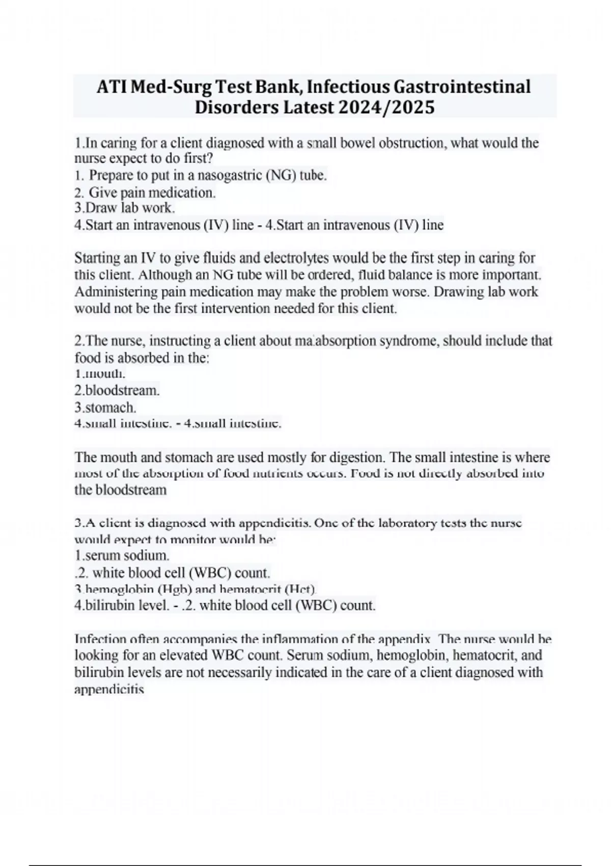 1.In caring for a client diagnosed with a small bowel obstruction, what would the nurse expect to do first? 1. Prepare to put in a nasogastric (NG) tube. 2. Give pain medication. 3.Draw lab work. 4.Start an intravenous (IV) line - 4.Start an intravenous (IV) line Starting an IV to give fluids and electrolytes would be the first step in caring for this client. Although an NG tube will be ordered, fluid balance is more important. Administering pain medication may make the problem worse. Drawing lab work would not be the first intervention needed for this client. 2.The nurse, instructing a client about malabsorption syndrome, should include that food is absorbed in the: . stream. ch. intestine. - intestine. The mouth and stomach are used mostly for digestion. The small intestine is where most of the absorption of food nutrients occurs. Food is not directly absorbed into the bloodstream 3.A client is diagnosed with appendicitis. One of the laboratory tests the nurse would expect to monitor would be: sodium. .2. white blood cell (WBC) count. lobin (Hgb) and hematocrit (Hct). ubin level. - .2. white blood cell (WBC) count. Infection often accompanies the inflammation of the appendix. The nurse would be looking for an elevated WBC count. Serum sodium, hemoglobin, hematocrit, and bilirubin levels are not necessarily indicated in the care of a client diagnosed with appendicitis ATI Med-Surg Test Bank, Infectious Gastrointestinal Disorders Latest 2024/2025 4.When assessing the pain in a client diagnosed with appendicitis, the nurse would expect to assess: me pain with slight palpation anywhere on the abdomen. in the upper back when the right lower quadrant is palpated. pain when the pressure is released in the right lower quadrant. pain when the abdomen is palpated. - ANS: 3 Typically rebound pain is associated with appendicitis. Rebound pain is described as more pain when pressure is released than when pressure is applied. Appendicitis pain is not associated with pain anywhere on the abdomen upon slight palpation. Appendicitis pain is not typically assessed in the upper back. Appendicitis is associated with pain. 5.A client is being evaluated for symptoms associated with diverticular disease. The nurse realizes that the best diagnostic test to be used to aid in this diagnosis would be: ted tomography (CT) scan. m enema. sound. 4.x-ray study. - ANS: 1 A CT scan is the best method of detecting abscesses and complications evidenced in diverticulitis. Barium enema is contraindicated in acute diverticulitis because of the risk of contamination if there is an existing perforation. An ultrasound or x-rays would not adequately diagnose the presence of the disorder. 6.An elderly client has noted blood in her stool for the past few months. Which information in the medical history would strongly suggest colorectal cancer? 1.Increased bouts of vomiting 2.Change in bowel habits 3.Recent infection in the blood 4.Decrease in appetite - ANS: 2 Change in bowel habits is one of the seven danger signals for cancer. Changes in bowel habits and blood in the stool are common signs of colorectal cancer. Vomiting, decreased appetite, or recent blood infection could be symptoms of other health problems, but they are not necessarily colorectal cancer. 7.The nurse is caring for a client diagnosed with irritable bowel syndrome (IBS) who is experiencing diarrhea. What medication would the nurse expect to administer? 1.Loperamide (Imodium) 2.Docusate sodium (Colace) 3.Lorazepam (Ativan) 4.Haloperidol (Haldol) - ANS: 1 Antidiarrheal agents like Imodium can be given prophylactically or symptomatically on an asneeded basis. Docusate sodium (Colace), lorazepam (Ativan), and haloperidon (Haldol) are not indicated to treat this disorder. 8.A client complains of acute gastrointestinal distress. While obtaining a health history, the nurse asks about the family history. Which disorder has a familial basis? 1. Hepatitis 2. Ulcerative colitis 3. Appendicitis 4. Bowel obstructions - ANS: 2 Genetic factors have been identified as susceptibility factors for the development of ulcerative colitis. None of the other choices have a genetic predisposition for developing the disorder. A client diagnosed with appendicitis asks the nurse why this illness occurred. The nurse should respond that the most common cause of appendicitis is: 1. ulcerative colitis. 2. obstruction of the appendix . -fat diet tion. - ANS: 2 An infection may occur with appendicitis, but the most common cause of infection is an obstruction of the appendix. The obstruction could be caused by lymph tissue, a fecalith, a foreign body, or worms. Ulcerative colitis, low-fat diet, or infection does not cause appendicitis. A young client is experiencing acute abdominal pain. The nurse realizes that the most common cause for this type of pain would be: dicitis. 2. biliary tract disease. 3. kidney stones. 4. urinary tract infection. - ANS: 1 The most common cause of acute abdominal pain is appendicitis. Biliary tract disease is the most common disorder in the elderly, causing pain in the right upper quadrant. Kidney stones and urinary tract infections do not necessarily cause abdominal pain. A client experiencing abdominal pain and diarrhea tells the nurse that he used to smoke. Which of the following gastrointestinal disturbances is this client most likely experiencing? 1.Irritable bowel syndrome 2.Crohns disease 3. Acute appendicitis 4. Small bowel obstruction - ANS: 2 Current and former smokers appear to have a greater risk of developing Crohns disease than nonsmokers. Not smoking will not cause irritable bowel syndrome, acute appendicitis, or small bowel obstruction. A client has a history of being treated for ulcerative colitis. The nurse realizes that a life threatening complication of this disorder is: 1. Crohns disease. 2. small bowel obstruction. c ulcer disease. megacolon. - ANS: 4 Toxic megacolon is a life-threatening complication of ulcerative colitis, and it requires imme