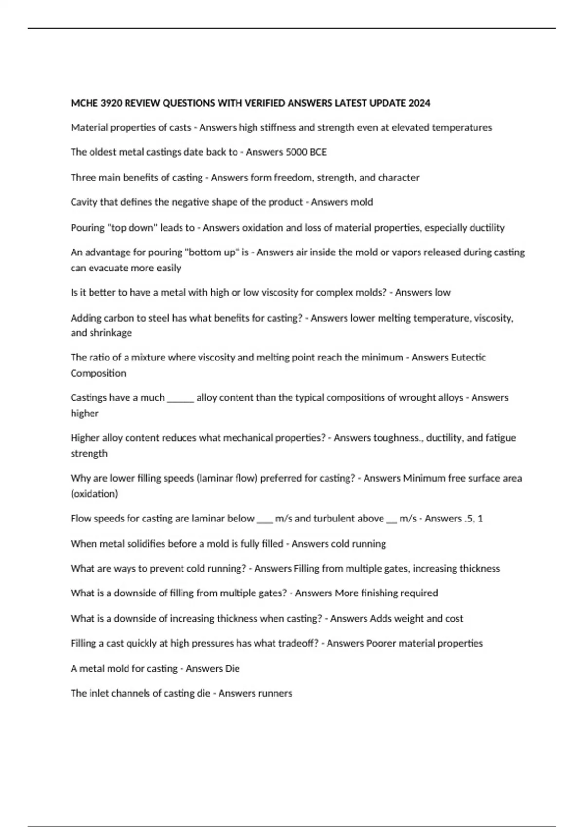MCHE 3920 REVIEW QUESTIONS WITH VERIFIED ANSWERS LATEST UPDATE 2024 Material properties of casts - Answers high stiffness and strength even at elevated temperatures The oldest metal castings date back to - Answers 5000 BCE Three main benefits of casting - Answers form freedom, strength, and character Cavity that defines the negative shape of the product - Answers mold Pouring "top down" leads to - Answers oxidation and loss of material properties, especially ductility An advantage for pouring "bottom up" is - Answers air inside the mold or vapors released during casting can evacuate more easily Is it better to have a metal with high or low viscosity for complex molds? - Answers low Adding carbon to steel has what benefits for casting? - Answers lower melting temperature, viscosity, and shrinkage The ratio of a mixture where viscosity and melting point reach the minimum - Answers Eutectic Composition Castings have a much _____ alloy content than the typical compositions of wrought alloys - Answers higher Higher alloy content reduces what mechanical properties? - Answers toughness., ductility, and fatigue strength Why are lower filling speeds (laminar flow) preferred for casting? - Answers Minimum free surface area (oxidation) Flow speeds for casting are laminar below ___ m/s and turbulent above __ m/s - Answers .5, 1 When metal solidifies before a mold is fully filled - Answers cold running What are ways to prevent cold running? - Answers Filling from multiple gates, increasing thickness What is a downside of filling from multiple gates? - Answers More finishing required What is a downside of increasing thickness when casting? - Answers Adds weight and cost Filling a cast quickly at high pressures has what tradeoff? - Answers Poorer material properties A metal mold for casting - Answers Die The inlet channels of casting die - Answers runners The outlet channels of a casting die - Answers risers Pour weight of a cast should be ____% or more of the weight of the casting itself - Answers 40 Minimizing surplus in pouring in casting by mold design - Answers Methoding ratio of volume to surface area (casting) - Answers Thermal modulus Chvorinov's Rule applies well to relatively _____ castings because the volume of material involved determines the speed of solidification - Answers large For thin-walled castings (less then 4mm thick), Chvorinov's Rule strongly _____________ the solidification time - Answers underestimates Three main quality issues in casting of metals - Answers porosity formation, internal stresses, distortion Porosity increases when percent shrinkage ________ - Answers increases What causes internal stresses in casting? - Answers Temperature differences during cooling for thick and thin sections If the temperature stresses in casting exceed ________, we get deformation or internal stresses based on the surrounding mold - Answers yield stress What categories of alloying elements are found in casting metals? - Answers improve processability, properties, impurities For a given casting alloy, a ______ casting will have poorer properties than a _______ one - Answers big, small High melting point powders added before pouring a casting - Answers innoculants What are the positives of sand casting? - Answers Can deal with all common casting metals, cheap, wide range of sizes What are the negatives of sand casting? - Answers fragile, low filling speeds and pressures, poor conductors of heat, qualities, tolerances. Lower mold half in a sand mold - Answers Drag Higher mold half in a sand mold - Answers Cope Hollow products can be casted using _________ - Answers sand cores Downward channel in a sand mold - Answers sprue The feeder is located where on a sand cast? - Answers highest point in thickest part Atmospheric pressure steel die casting is called _______ - Answers Gravity die casting Advantages of gravity die casting are ___________ - Answers good tolerances, short cycle times, no machining required Disadvantages of gravity die casting include __________ - Answers low fill speed, limited size and weight, only Al and MG Low pressure (2 to 5 bar) steel die casting is called - Answers low pressure die casting Advantages of low-pressure die casting - Answers fine details, high quality from laminar flow Which metals can be low-pressure die cast? - Answers Mg, Al What is usually made from low-pressure die casting? - Answers alloy wheels High pressure (2000 bar) steel die casting is called - Answers High pressure die casting Disadvantages of high pressure die casting - Answers expensive, cannot use sand cores, poor quality What metals can be high-pressure die cast? - Answers Zn, Al, Mg Advantages of high-pressure die casting? - Answers thinner products, fast cooling, short cycle times, no processing, high tolerances In investment casting, _____ is used to produce a pattern - Answers wax Sheet metal forming has ____ production volume - Answers high Design process is iterative and involves continual tradeoffs between ___________ - Answers function, quality, cost Casting: Cooling from liquid to solid is accompanied by ________ in volume - Answers Reduction Casting: Rate of volume reduction is __________ in solidification range - Answers highest Energy from Tpouring to Tsolidus - Answers Specific heat, liquid phase Energy from Liquid to solid phase transition - Answers Latent heat of solidification Energy from Tsolidus to RT - Answers Specific heat, solid phase How to account for casting shrinkage that occurs after solidification? - Answers bigger mold, 1-2%
