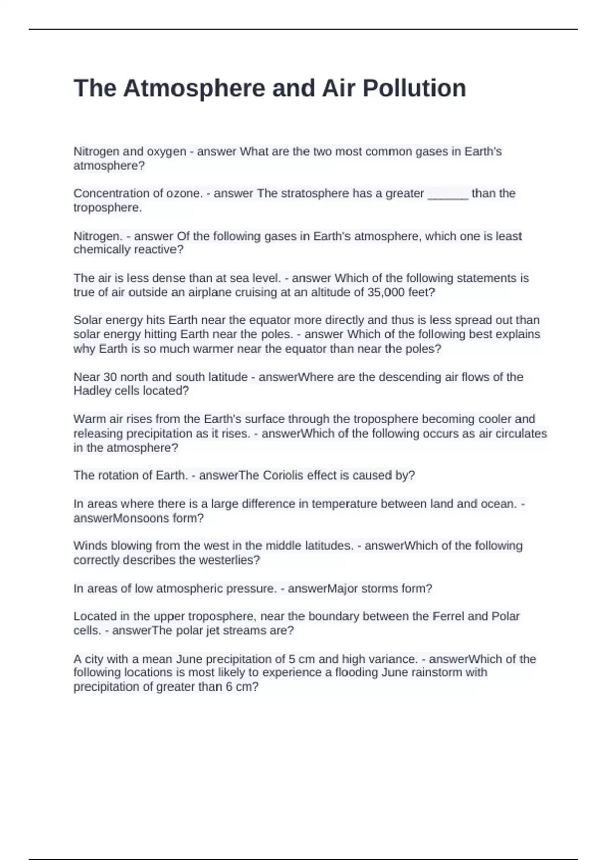 The Atmosphere and Air Pollution Questions and Answers 100% Solved