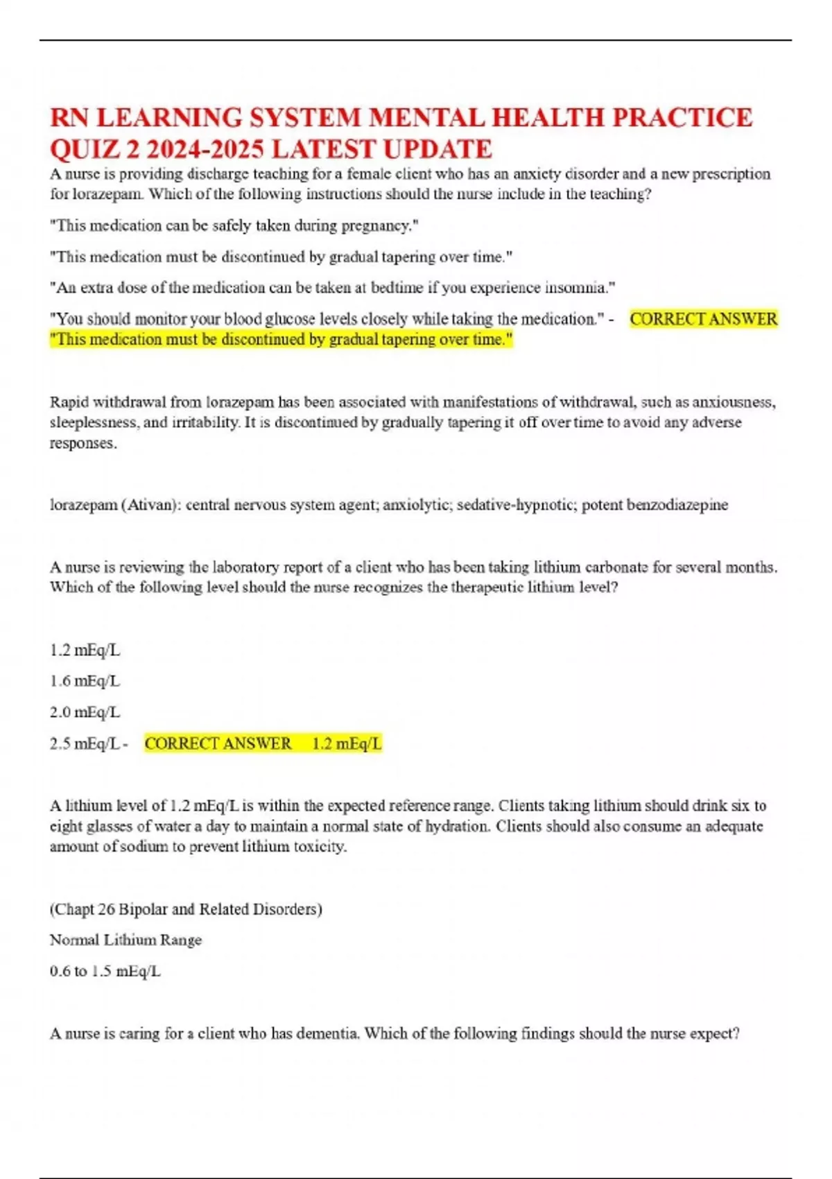 RN LEARNING SYSTEM MENTAL HEALTH PRACTICE QUIZ LATEST UPDATEA nurse is providing discharge teaching for a female client who has an anxiety disorder and a new prescription for lorazepam. Which of the following instructions should the nurse include in the teaching? "This medication can be safely taken during pregnancy." "This medication must be discontinued by gradual tapering over time." "An extra dose of the medication can be taken at bedtime if you experience insomnia." "You should monitor your blood glucose levels closely while taking the medication." - CORRECT ANSWER "This medication must be discontinued by gradual tapering over time." Rapid withdrawal from lorazepam has been associated with manifestations of withdrawal, such as anxiousness, sleeplessness, and irritability. It is discontinued by gradually tapering it off over time to avoid any adverse responses. lorazepam (Ativan): central nervous system agent; anxiolytic; sedative-hypnotic; potent benzodiazepine A nurse is reviewing the laboratory report of a client who has been taking lithium carbonate for several months. Which of the following level should the nurse recognizes the therapeutic lithium level? 1.2 mEq/L 1.6 mEq/L 2.0 mEq/L 2.5 mEq/L - CORRECT ANSWER 1.2 mEq/L A lithium level of 1.2 mEq/L is within the expected reference range. Clients taking lithium should drink six to eight glasses of water a day to maintain a normal state of hydration. Clients should also consume an adequate amount of sodium to prevent lithium toxicity. (Chapt 26 Bipolar and Related Disorders) Normal Lithium Range 0.6 to 1.5 mEq/L A nurse is caring for a client who has dementia. Which of the following findings should the nurse expect? Altered level of consciousness Impaired judgment Rapid change in personality Disturbances in perception - CORRECT ANSWER Impaired judgment Impaired judgment occurs in clients who have dementia because they lose their ability to reason, think abstractly, and have rational thoughts. A nurse is reviewing the health history of a young adult client who has depressive disorder. Which of the following factors should the nurse identify as increasing the clients risk for depression? The client is an only child. The client lives in an urban setting. The client is married. The client is female. - CORRECT ANSWER The client is female. The nurse should identify female gender as a primary risk factor for depression. The incidence of depressive disorders is greater in women than in men by almost 2 to 1. I nurse is caring for a client who has a possessive compulsive disorder the client engages in repeated handwashing daily. Which of the following should the nurse recognize as the purpose of the clients behavior? Relieving anxiety Gaining attention Avoiding daily responsibilities Responding to auditory hallucinations - CORRECT ANSWER Relieving anxiety Ritualistic and compulsive behaviors, such as repeated handwashing, are associated with obsessive-compulsive disorder. The client has a strong urge to perform these acts in an attempt to reduce anxiety. Performing these acts only temporarily reduces the anxiety; therefore, the compulsive act must be repeatedly performed over and over again.