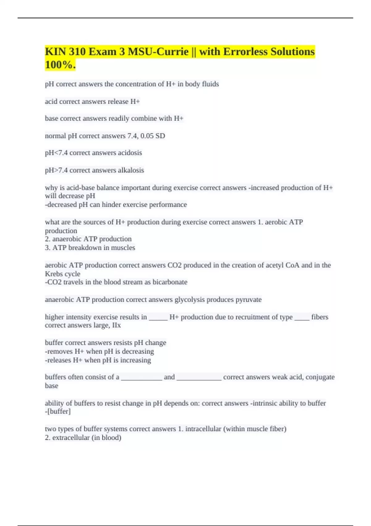 regulation of acid-base balance during exercise correct answers •increase [H+] and therefore ↓
