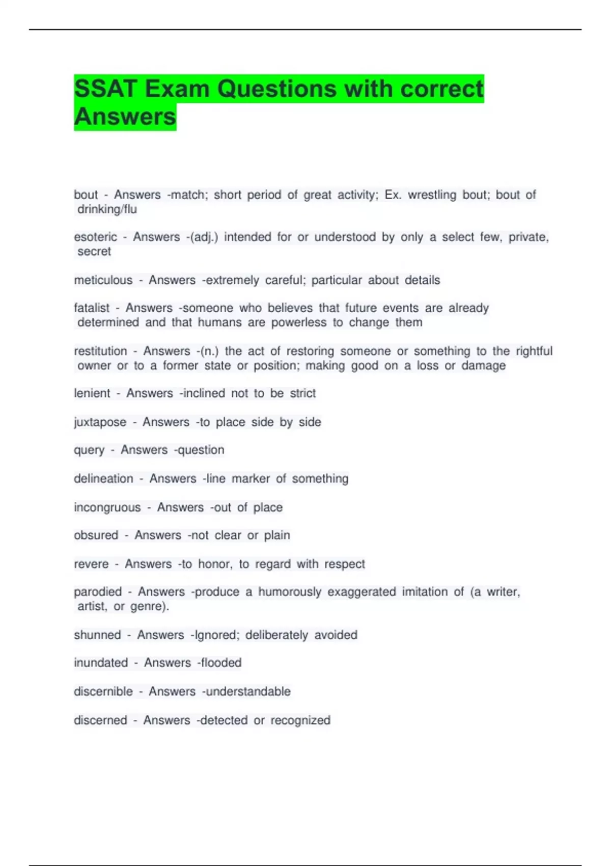SSAT Exam Questions with correct