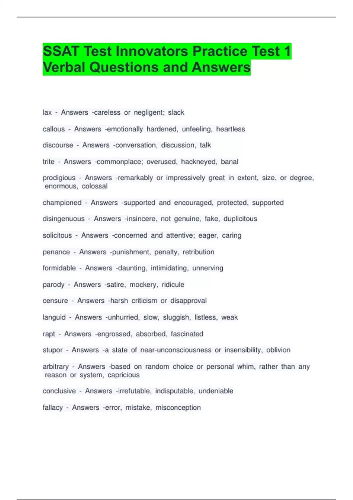 SSAT Test Innovators Practice Test 1