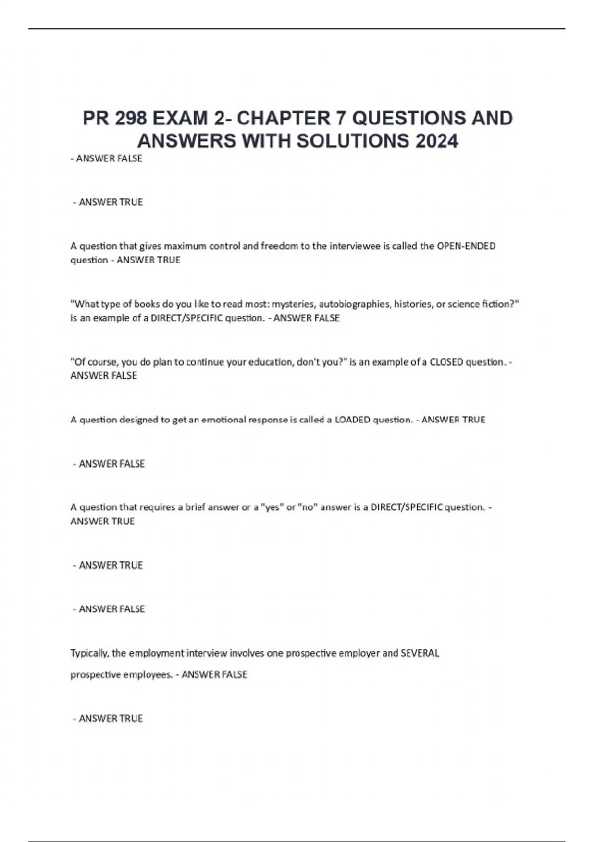 PR 298 EXAM 2- CHAPTER 7 QUESTIONS AND ANSWERS WITH SOLUTIONS 2024 - ANSWER FALSE - ANSWER TRUE A question that gives maximum control and freedom to the interviewee is called the OPEN-ENDED question - ANSWER TRUE "What type of books do you like to read most: mysteries, autobiographies, histories, or science fiction?" is an example of a DIRECT/SPECIFIC question. - ANSWER FALSE "Of course, you do plan to continue your education, don't you?" is an example of a CLOSED question. - ANSWER FALSE