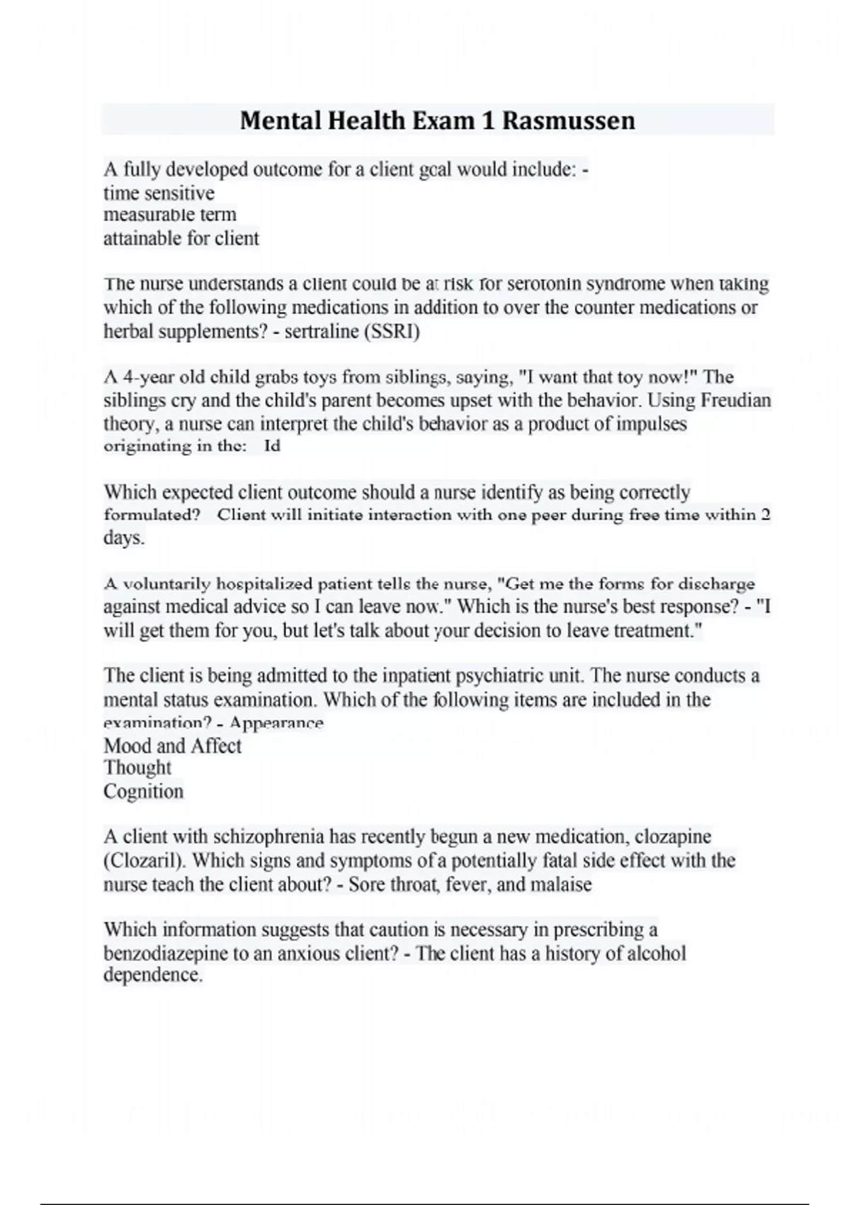 A fully developed outcome for a client goal would include: - time sensitive measurable term attainable for client The nurse understands a client could be at risk for serotonin syndrome when taking which of the following medications in addition to over the counter medications or herbal supplements? - sertraline (SSRI) A 4-year old child grabs toys from siblings, saying, "I want that toy now!" The siblings cry and the child's parent becomes upset with the behavior. Using Freudian theory, a nurse can interpret the child's behavior as a product of impulses originating in the: - Id Which expected client outcome should a nurse identify as being correctly formulated? - Client will initiate interaction with one peer during free time within 2 days. A voluntarily hospitalized patient tells the nurse, "Get me the forms for discharge against medical advice so I can leave now." Which is the nurse's best response? - "I will get them for you, but let's talk about your decision to leave treatment." The client is being admitted to the inpatient psychiatric unit. The nurse conducts a mental status examination. Which of the following items are included in the examination? - Appearance Mood and Affect Thought Cognition A client with schizophrenia has recently begun a new medication, clozapine (Clozaril). Which signs and symptoms of a potentially fatal side effect with the nurse teach the client about? - Sore throat, fever, and malaise Which information suggests that caution is necessary in prescribing a benzodiazepine to an anxious client? - The client has a history of alcohol dependence. A brother calls to speak to his sister who has been admitted to the psychiatric unit. The nurse connects him to the community phone and the sister is summoned. Later the nurse realizes that the brother was not on the client's approved call list. What law has the nurse broken? - The Health Insurance Portability and Accountability Act The client attempted suicide by overdosing on pain medication. Once the client ingested the medication, she decided that she did not want to die and she sought immediate treatment. Once the client recovered from the physical effects of overdose, the client voluntarily south inpatient mental health treatment. Which statement is true of voluntary admission? - The client retains the right to request release. A nurse says to a client, "Things will look better tomorrow after a good night's sleep." This is an example of which communication technique? - The nontherapeutic technique of giving reassurance. (false reassurance) A patient is involuntarily admitted to a psychiatric unit after calling a friend and saying, "I've got a gun and I'm going to shoot myself." Which of the following rights has the patient lost temporarily? - The right to leave the hospital without medical approval. A depressed client states, "I have a chemical imbalance in my brain. I have no control over my behavior. Medications are my only hope to feel normal again." Which nursing response is appropriate? - "Medications are one way to address chemical imbalances. Environmental and interpersonal factors can also have an impact on biological factors." During an intake interview, which question would assist the nurse in gathering data about the client's judgment? - "If you found a stamped, addressed envelope in the street, what would you do?" A nursing instructor asks a student to describe the nursing process when initiating care of a client. The student nurse understands the nursing process order to be correctly identified as: - Assessment, Nursing diagnosis, Outcomes, Planning, Implementation, Evaluation During an intake assessment, a nurse asks both physiological and psychosocial questions. The client angrily responds, "I'm here for my heart, not my head problems." Which is the nurse's best response? - Psychological factors, like excessive stress, have been found to affect medical conditions." A mother rescues two of her four children from a house fire. In an emergency department, she cries, "I should have gone back in to get them. I should have died, not them." Which of the following responses by the nurse is an example of reflection? - "You're feeling guilty because you weren't able to save your children." An entry level registered nurse works with patients in a community setting. Which groups should this nurse expect to lead? - Symptom management Medication education Self-care A client has been involuntarily admitted to an inpatient behavioral health unit. During this admission, which of the following rights does the client still retain? - The right to refuse medications The right to informed consent A mother who is notified that her child was killed in a tragic car accident states, "I can't bear to go on with my life." Which nursing statement conveys empathy? - "It must be horrible to lose a child, and I'll stay with you until your husband arrives." During the implementation phase of the nursing process, a nurse is teaching an adult depressed patient with a cochlear implant about medications. Which modification in the teaching plan would be the most appropriate for this client? - Speaking directly face-to-face A 22 year old college student is admitted to hospital following a suicide attempt and states, "No one will ever love a loser like me." According to Erikson's theory of personality development, a nurse should recognize a deficit in which developmental stage? - Intimacy vs Isolation A nursing instructor is teaching about the monoamine category of neurotransmitters. Which student statement indicates that learning about the function of norepinephrine has occurred? - Norepinephrine functions to regulate mood, cognition, and perception. A nurse is educating a patient about the difference between mental health and mental illness. Which statement by the patient reflects an accurate understanding of mental health? - Mental health is successful adaptation to stressors in the internal external environment. The nurse understands a c